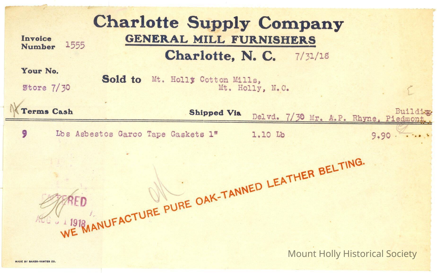 Invoice from Charlotte Supply Co. to Mt. Holly Cotton Mills for asbestos gaskets
