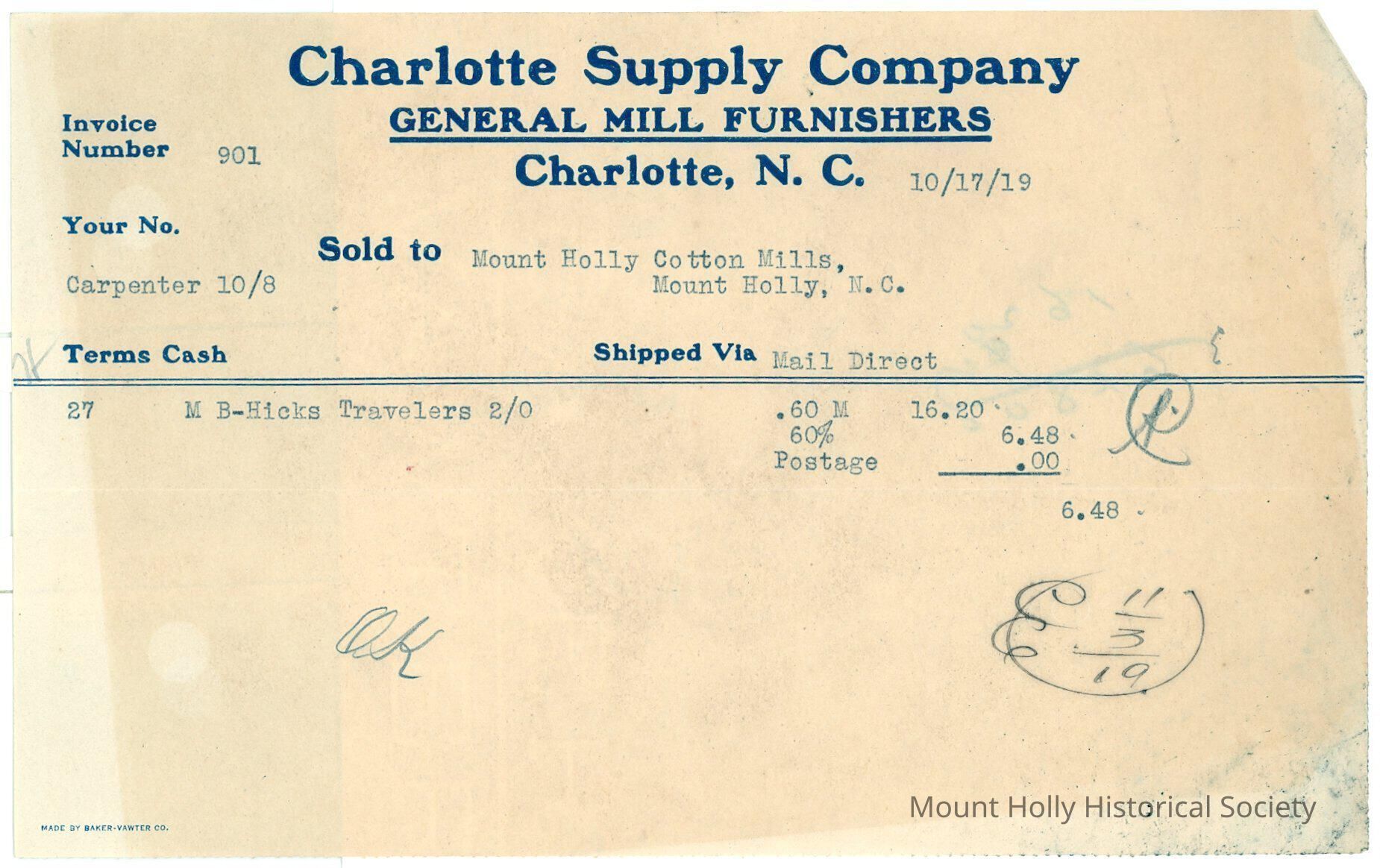 Invoice from Charlotte Supply Co. to Mt. Holly Cotton Mills for travelers