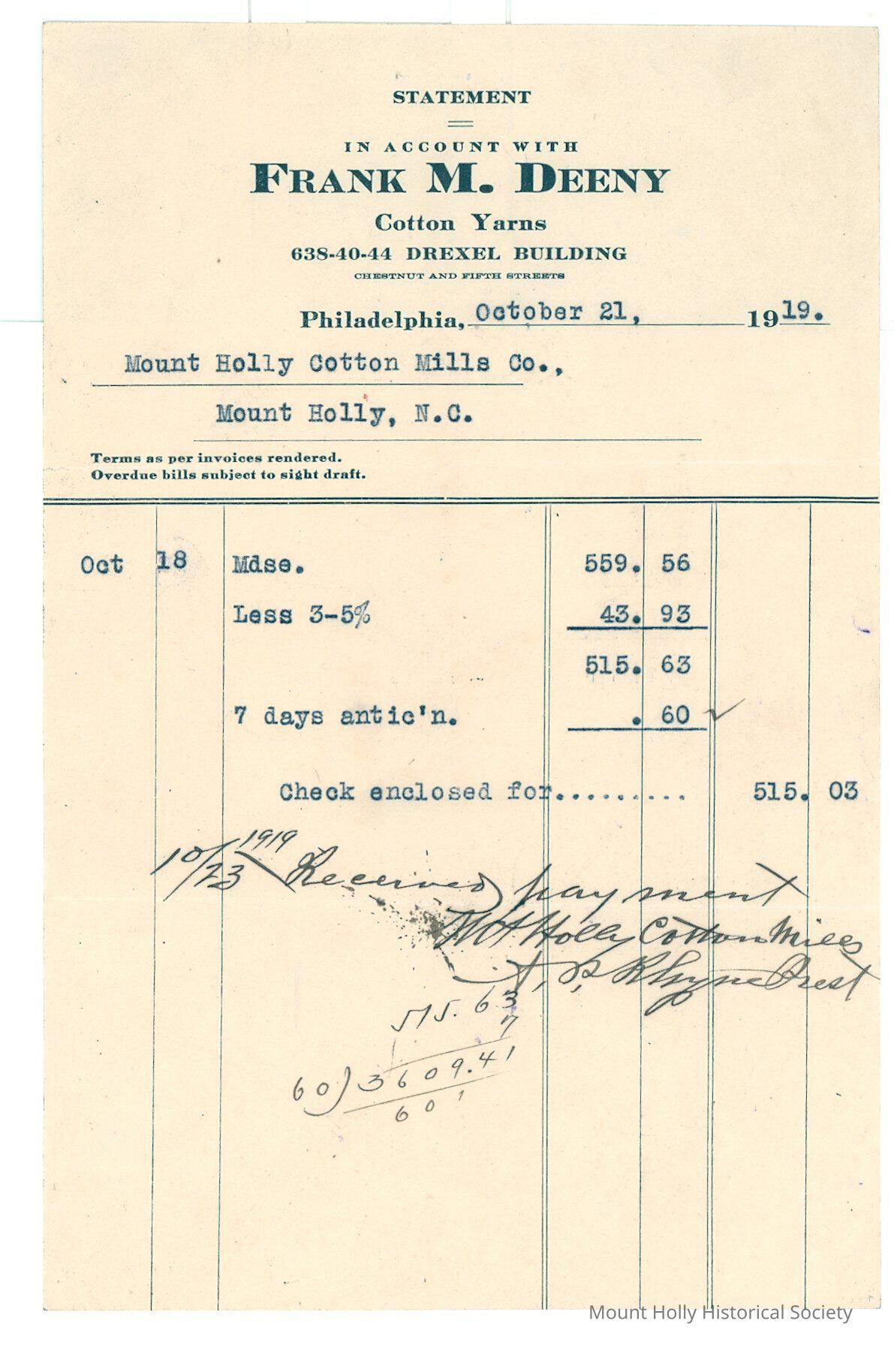 Payment from Frank M. Deeny to Mt. Holly Cotton Mills for $515.03