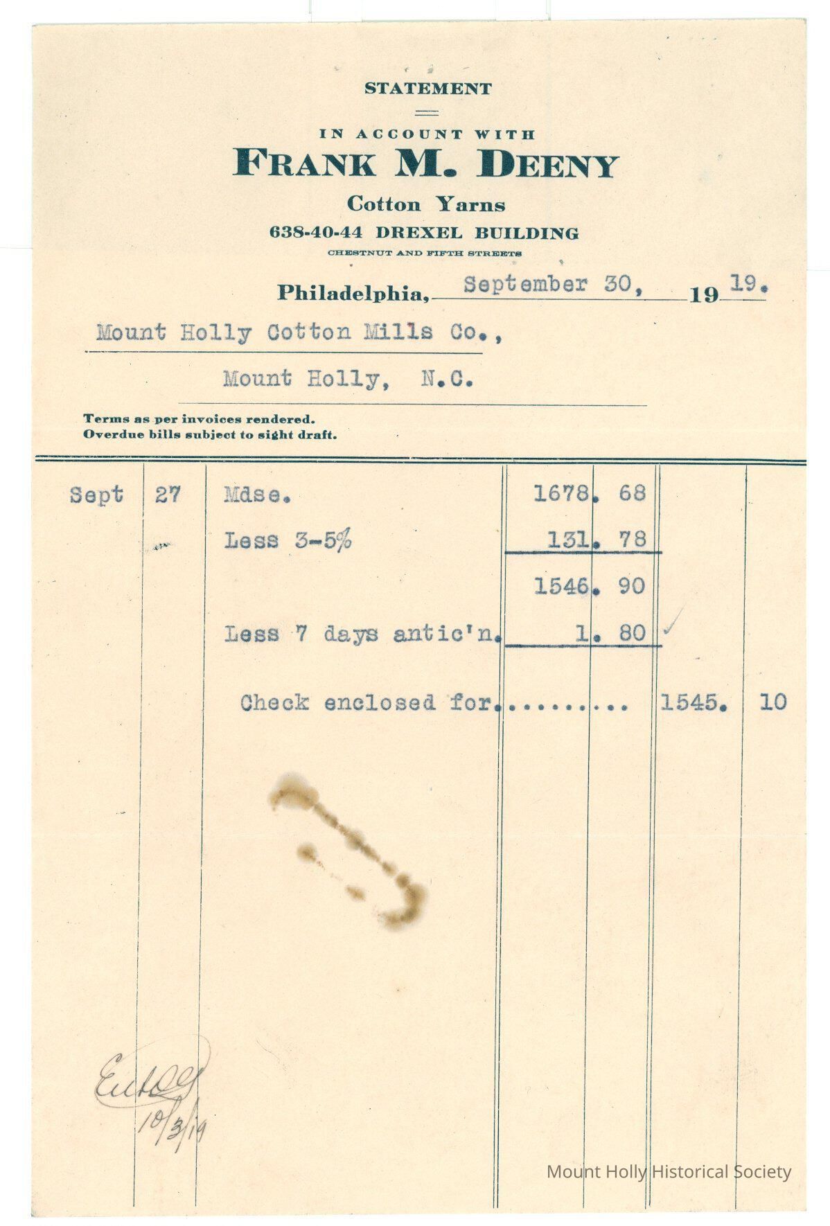 Payment from Frank M. Deeny to Mt. Holly Cotton Mills for $1,545.10