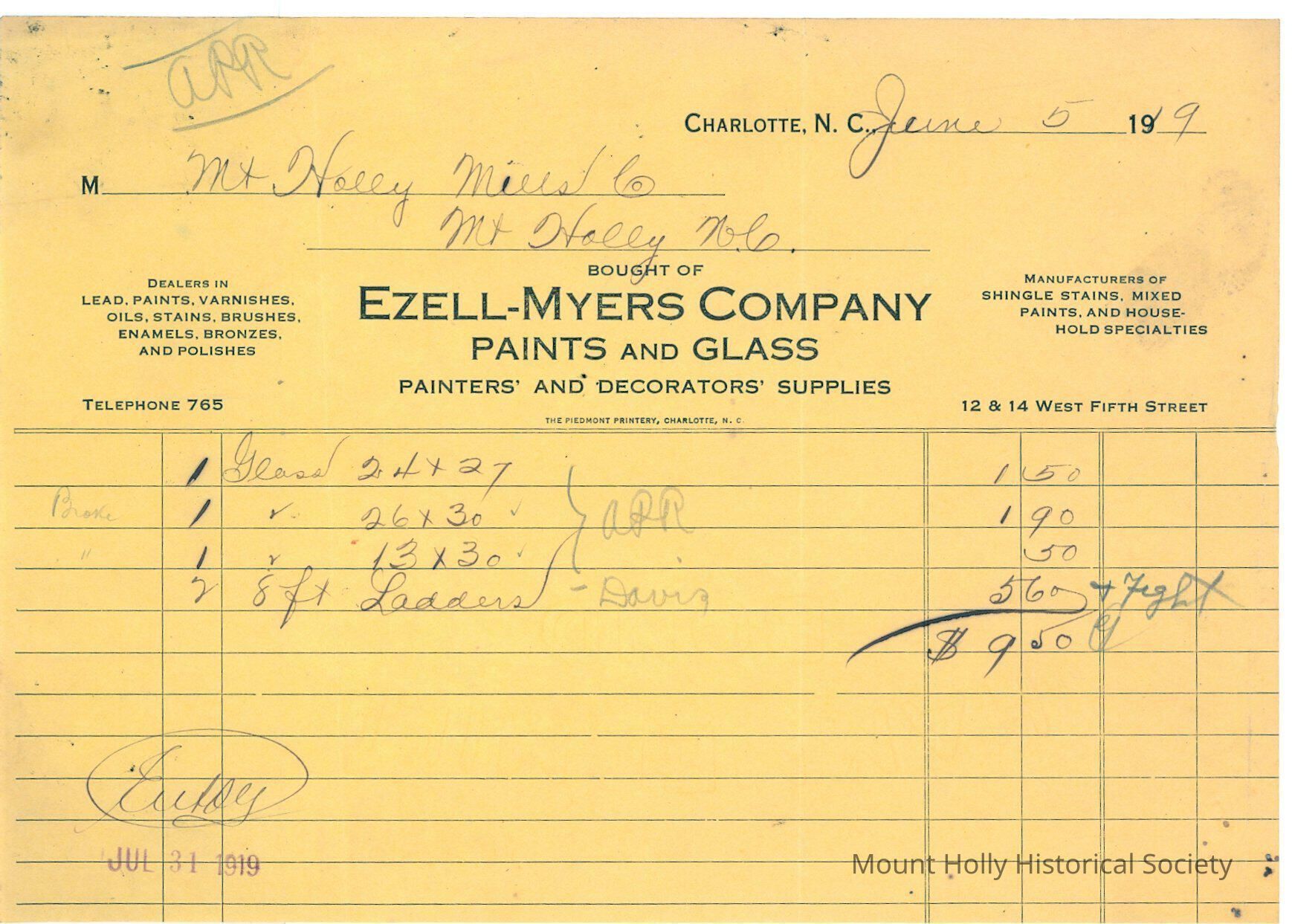 Invoice from Ezell-Myers Co. to Mt. Holly Cotton Mills for glass and ladders