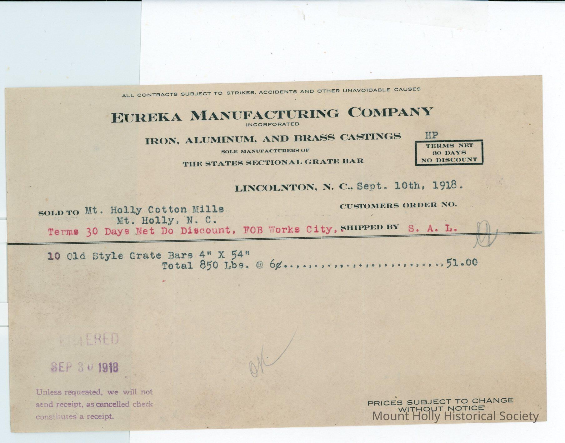 Invoice from Eureka Mfg. Co. to Mt. Holly Cotton Mills for ten grate bars