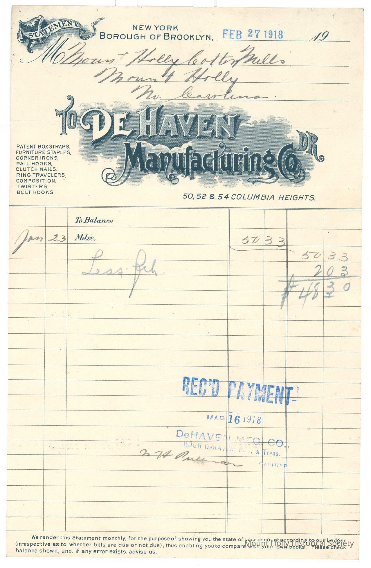 Statement from Mt.Holly Cotton Mills to De Haven Mfg. Co. for merchandise