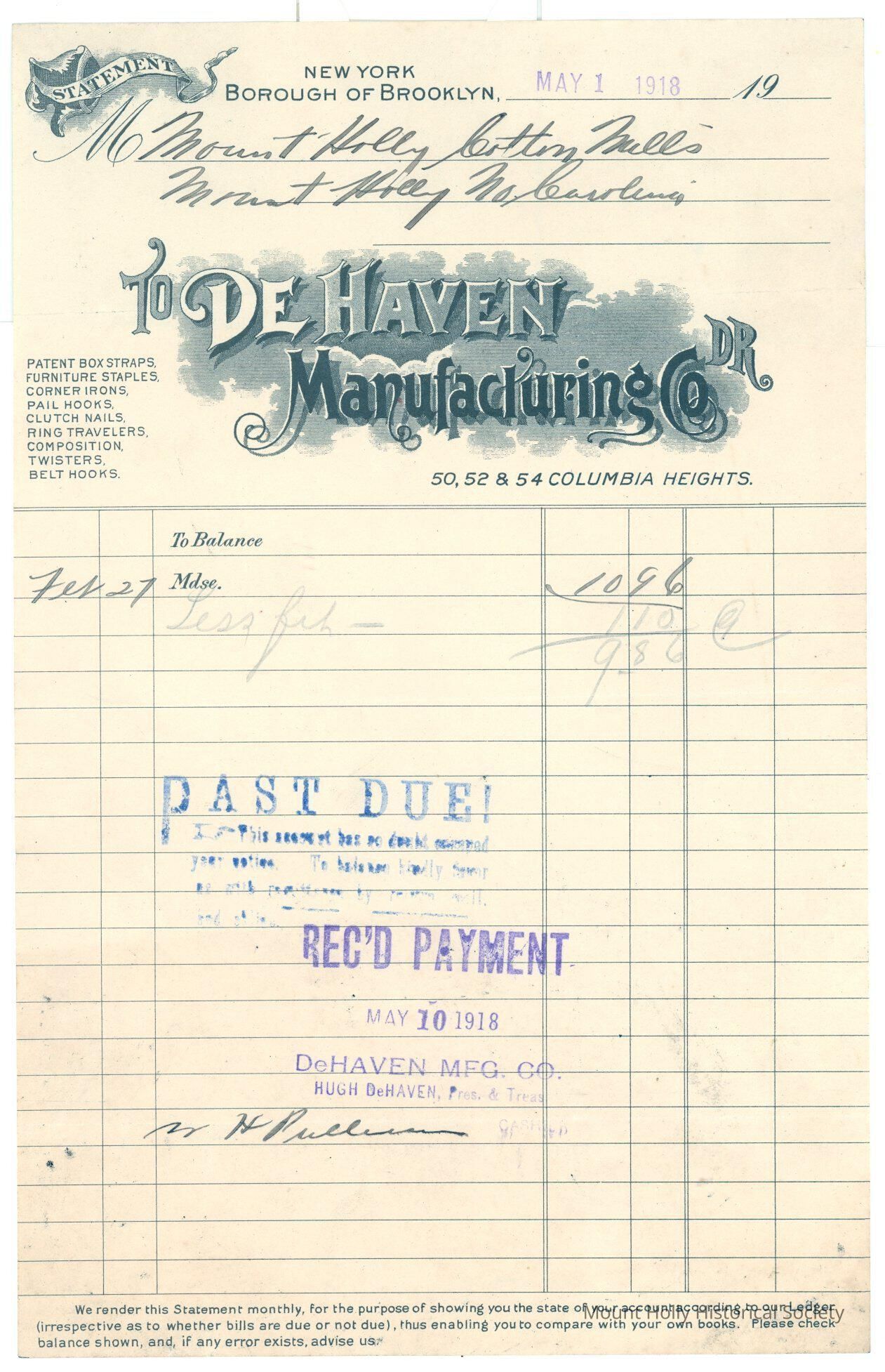 Statement from Mt.Holly Cotton Mills to De Haven Mfg. Co. for merchandise