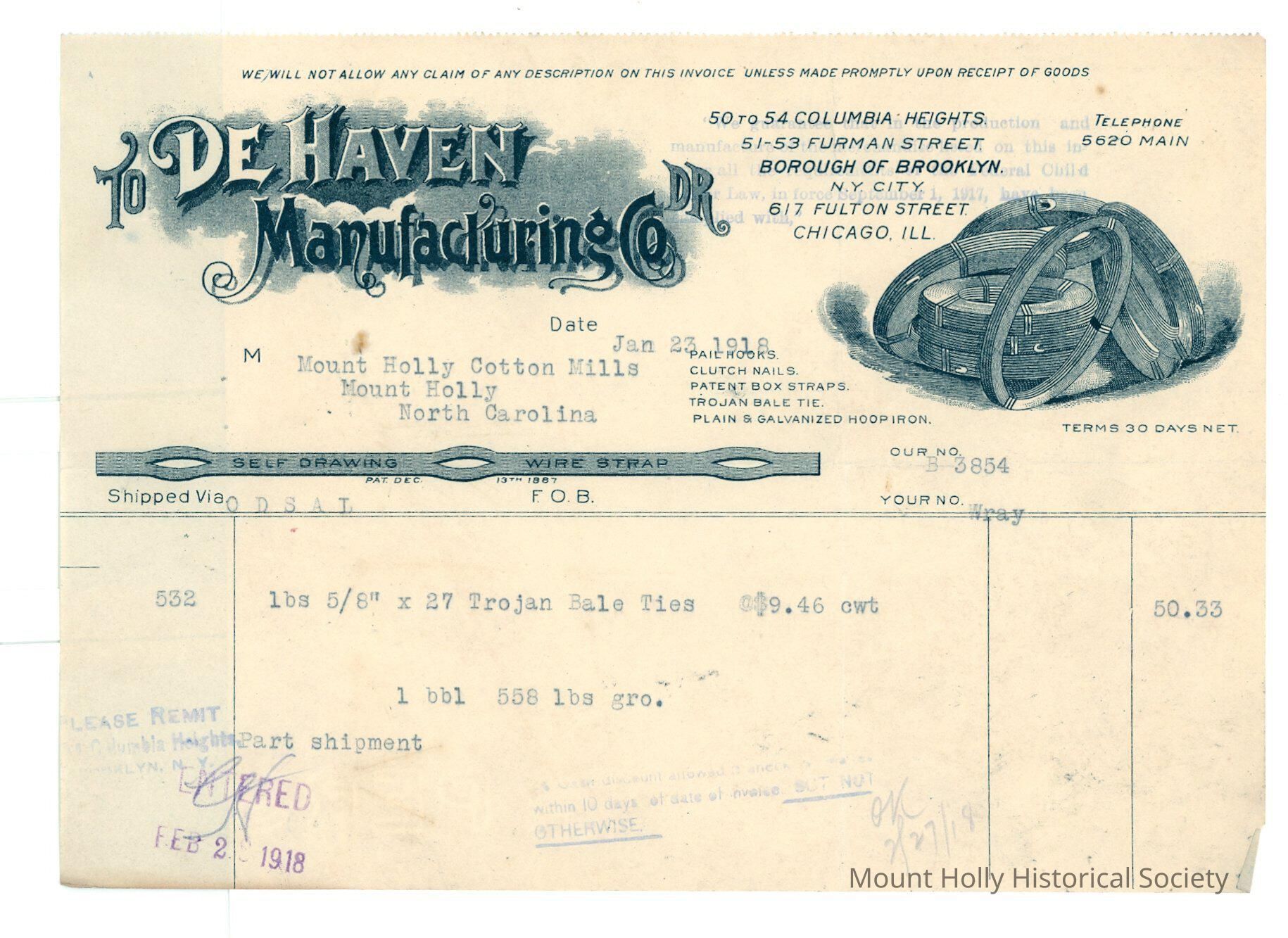 Invoice from Mt. Holly Cotton Mills to De Haven Mfg. Co. for 532 lbs. of bale ties