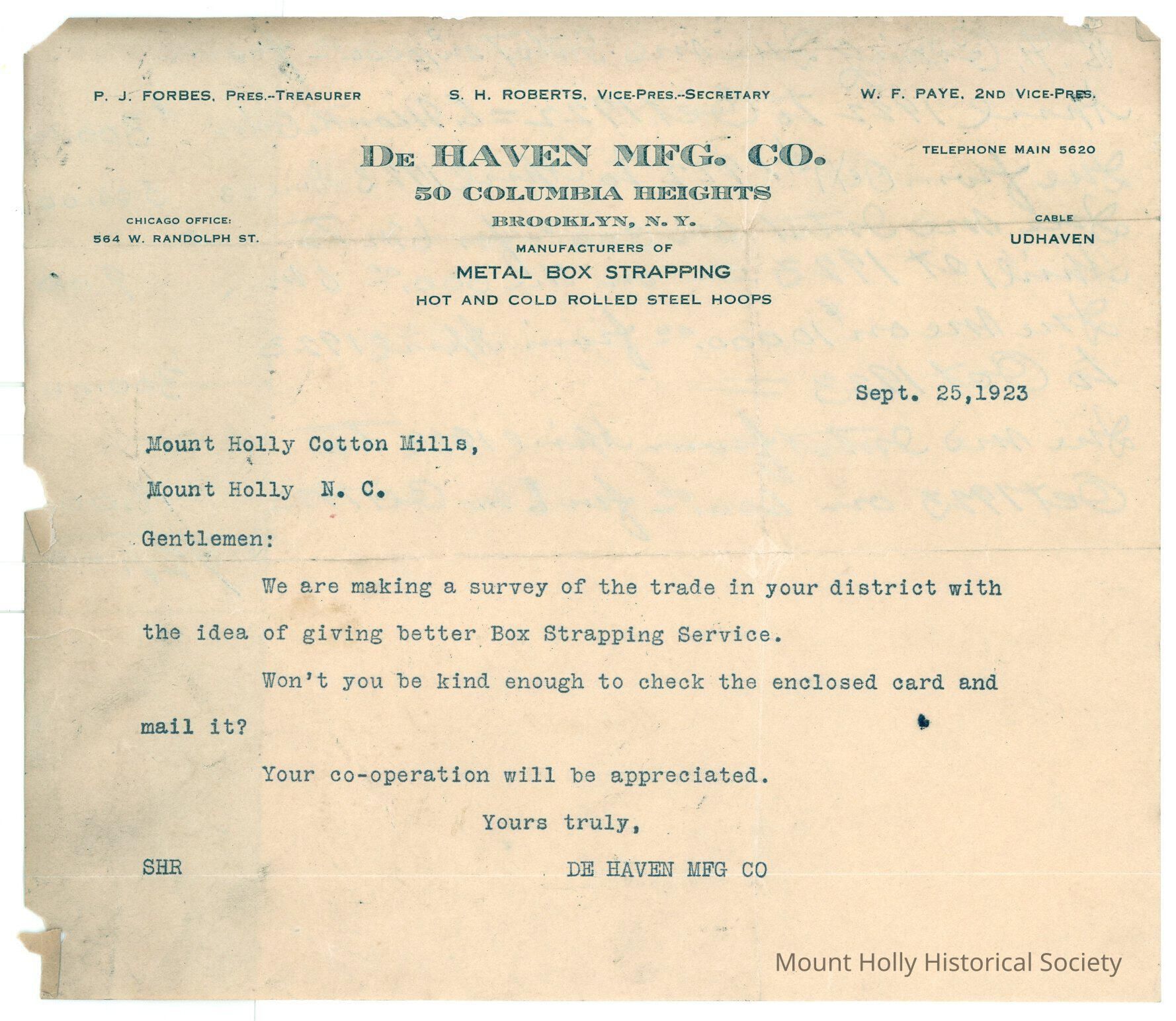 Letter from De Haven Mfg. Co. to Mt. Holly Cotton Mills asking for a trade survey; handwritten list of goods on back