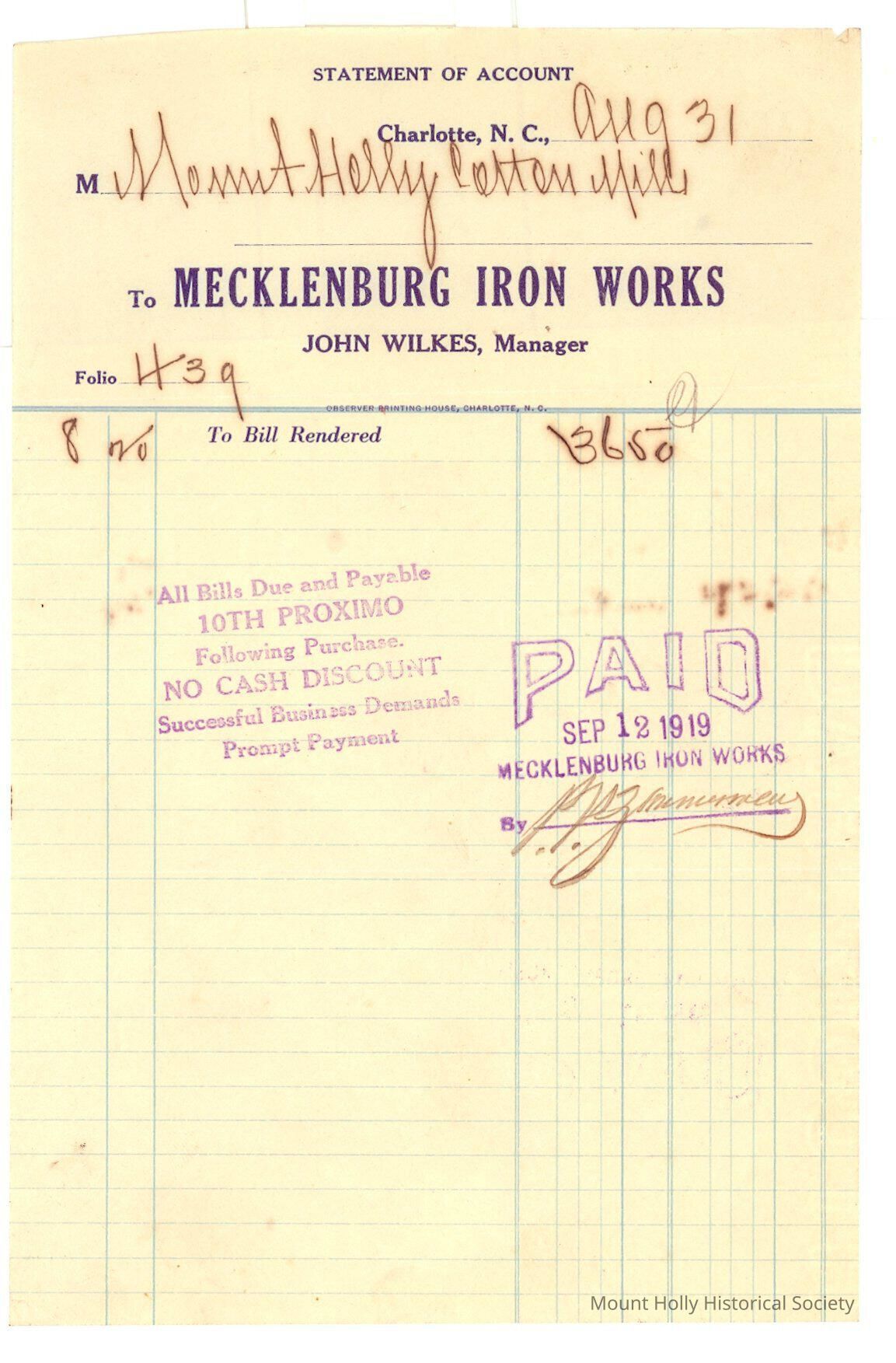 Bill from Mt. Holly Cotton Mills to Mecklenburg Iron Works