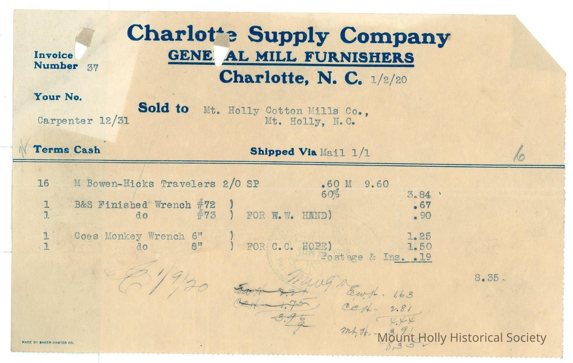 Invoice from Charlotte Supply Co. to Mt. Holly Cotton Mills for tools