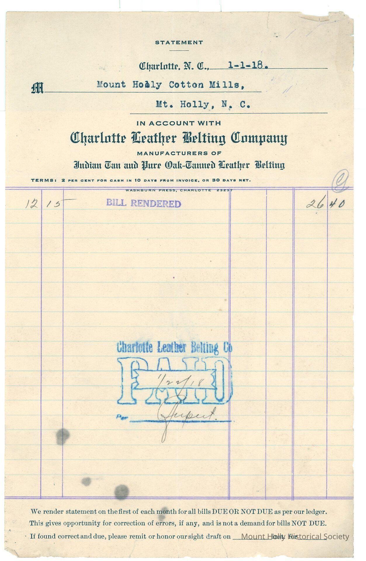 Statement from Mt. Holly Cotton Mills on account with Charlotte Leather Belting Co.