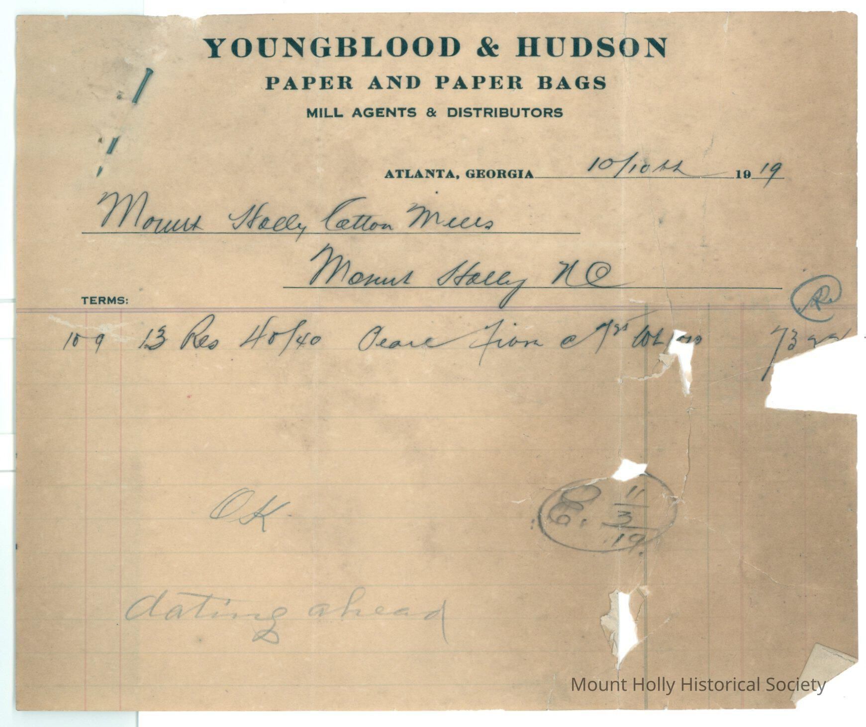 Invoice from Youngblood & Hudson to Mt. Holly Cotton Mills