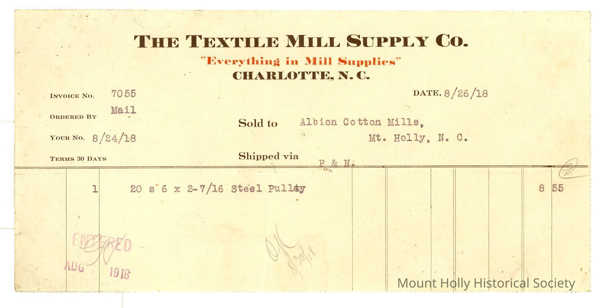 Invoice from Textile Mill Supply Co. to Albion Cotton Mills for steel pulley