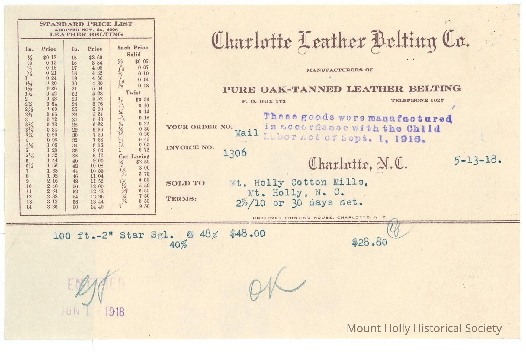 Invoice from Charlotte Leather Belting Co. to Mt. Holly Cotton Mills