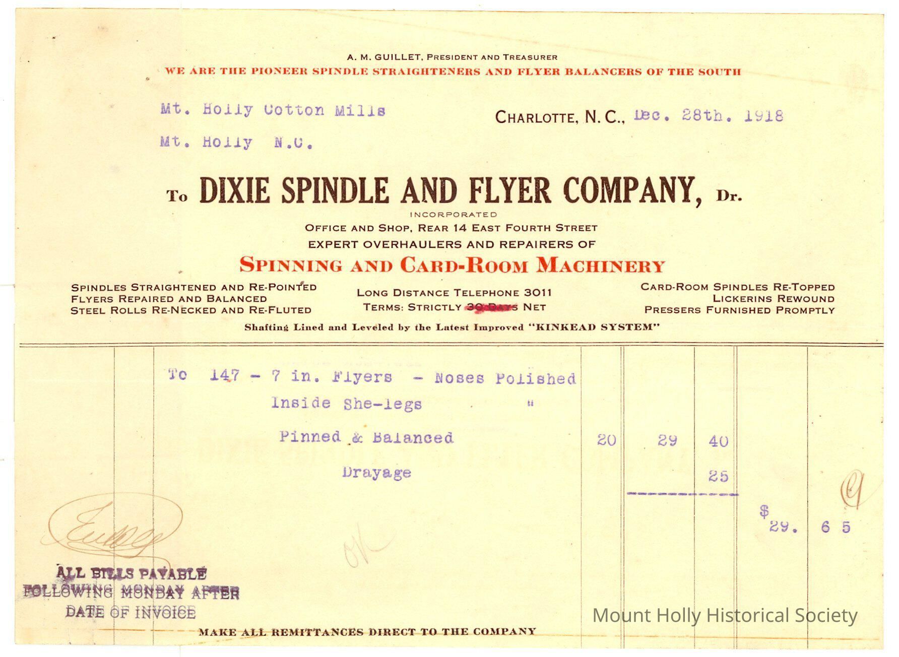 Invoice from Dixie Spindle & Flyer Co. to Mt. Holly Cotton Mills for repairing flyers