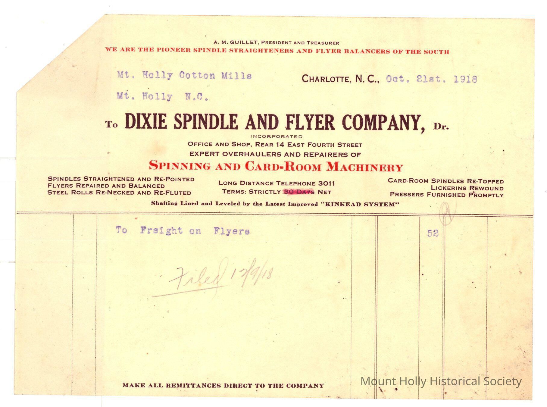 Invoice from Dixie Spindle & Flyer Co. to Mt. Holly Cotton Mills for freight on flyers