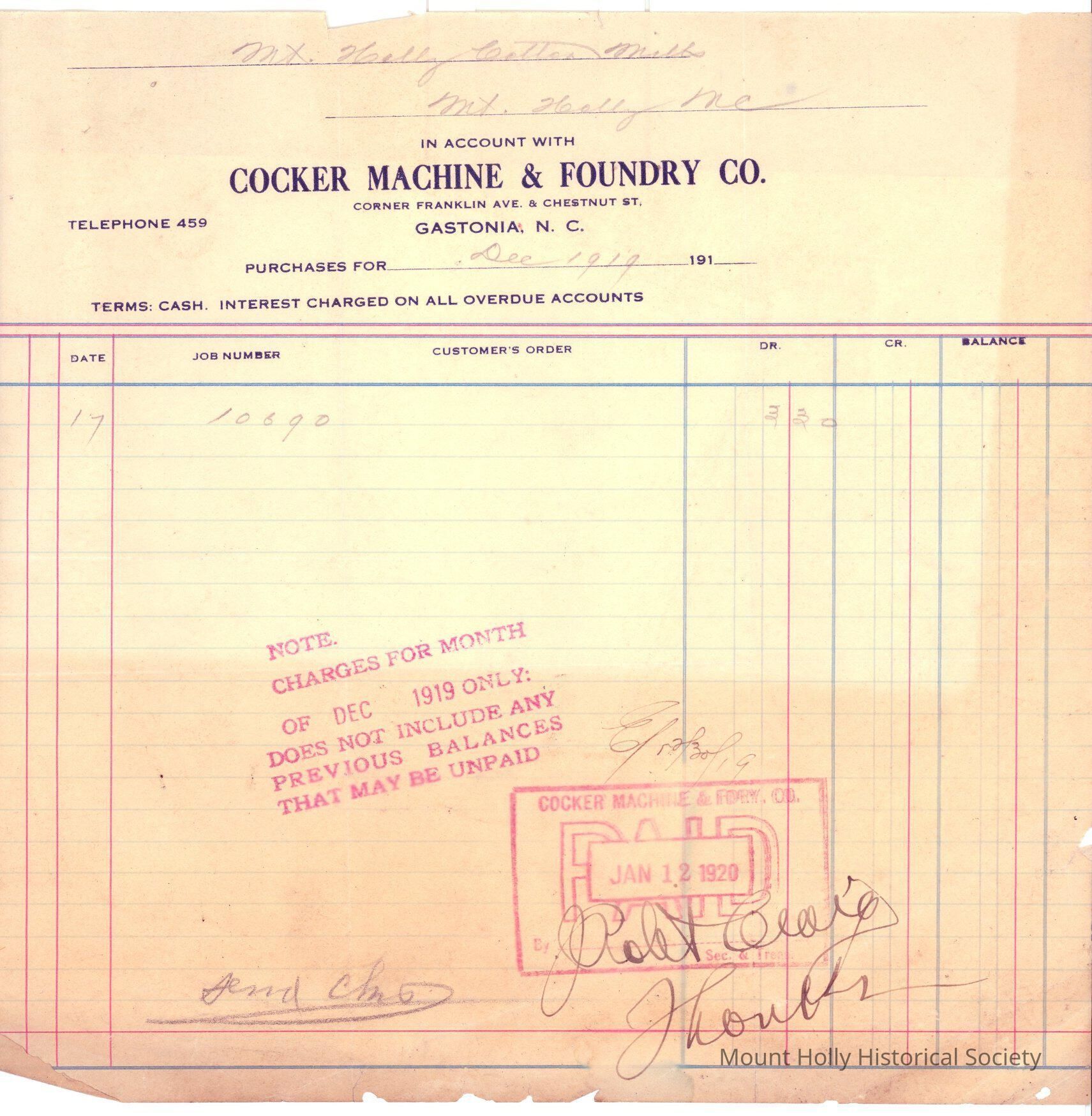 Statement of Mt. Holly Cotton Mills with Cocker Machine & Foundry Co.