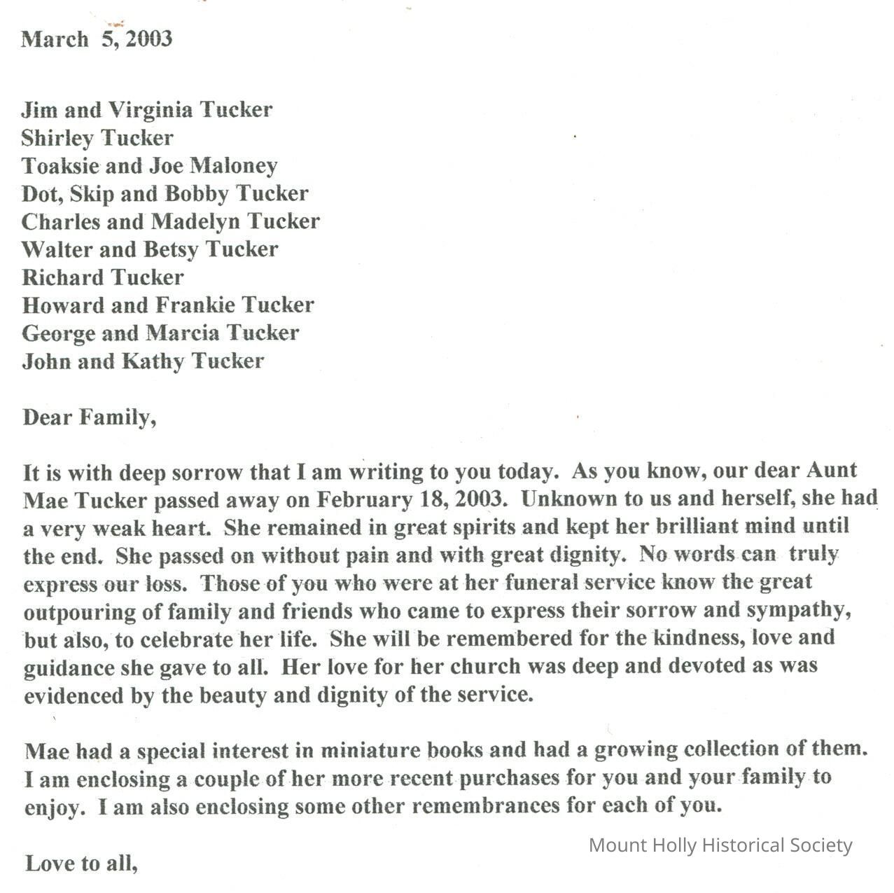 Letter to Tucker Family - Newspaper Artricle on Mae Tucker