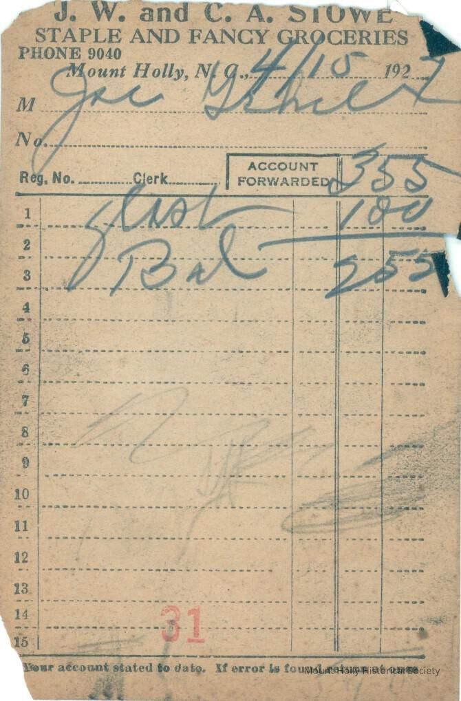 JW and CA Stowe - Staple and Fancy Groceries - Receipt