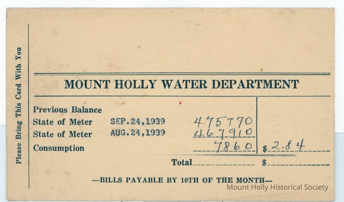 Mount Holly Water Dept. Bill/Statement to Luther Nims