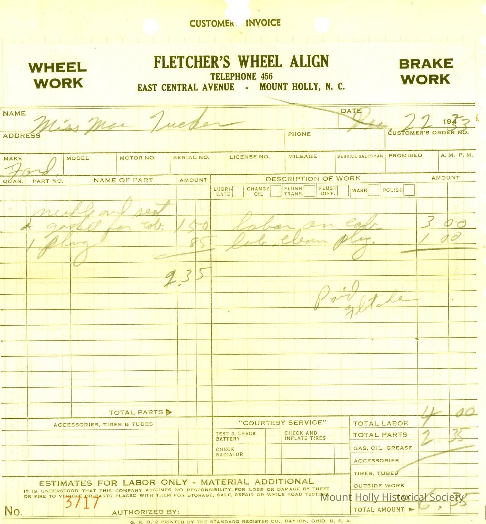 Fletcher's Wheel Align - Miss Mae Tucker - Receipt/Invoice
