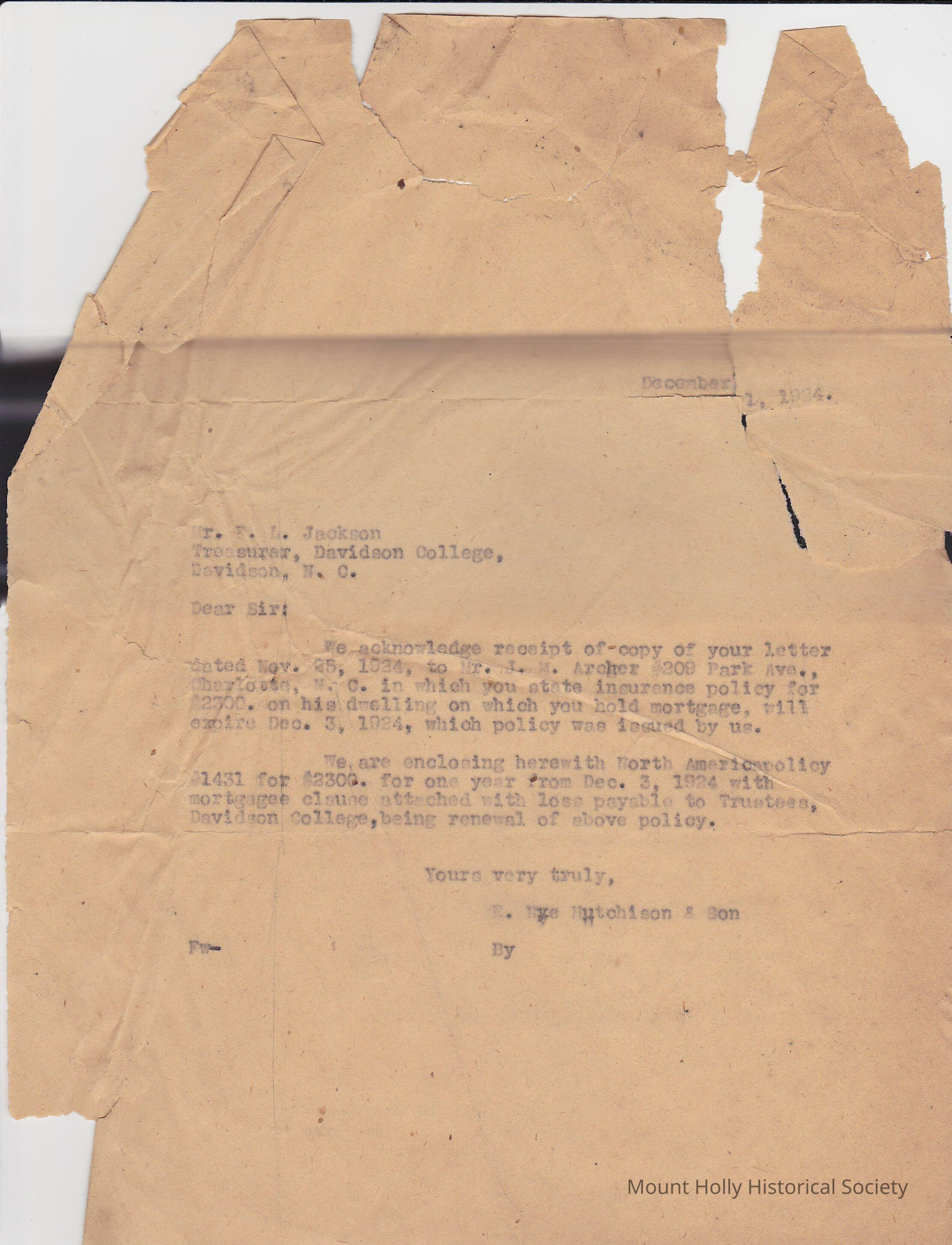 Letter - From E Nye Hutchinson to Mr. FL Jackson regarding insurnace