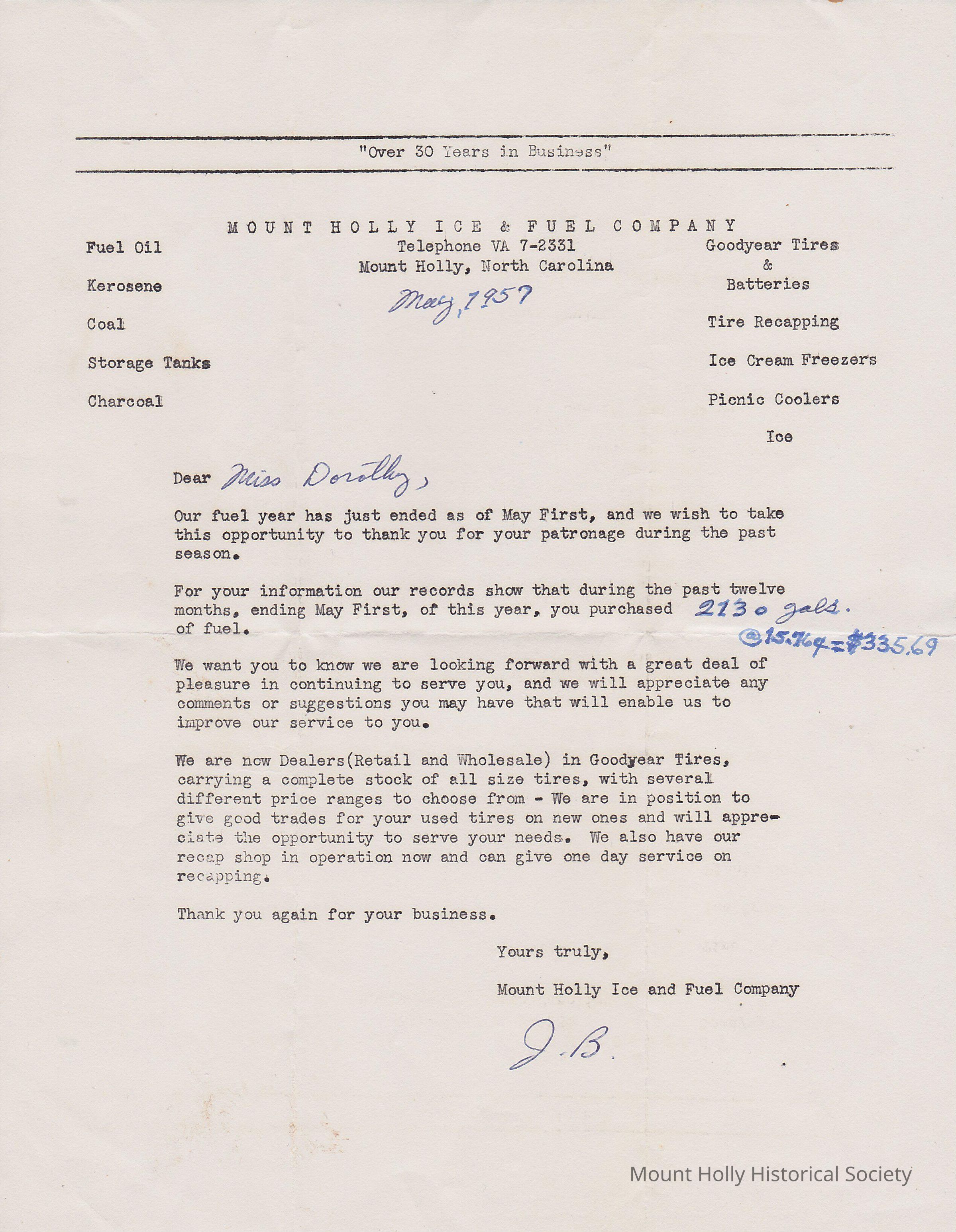 Letter from Mount Holly Ice and Fuel Co. to Miss Dorothy Nims