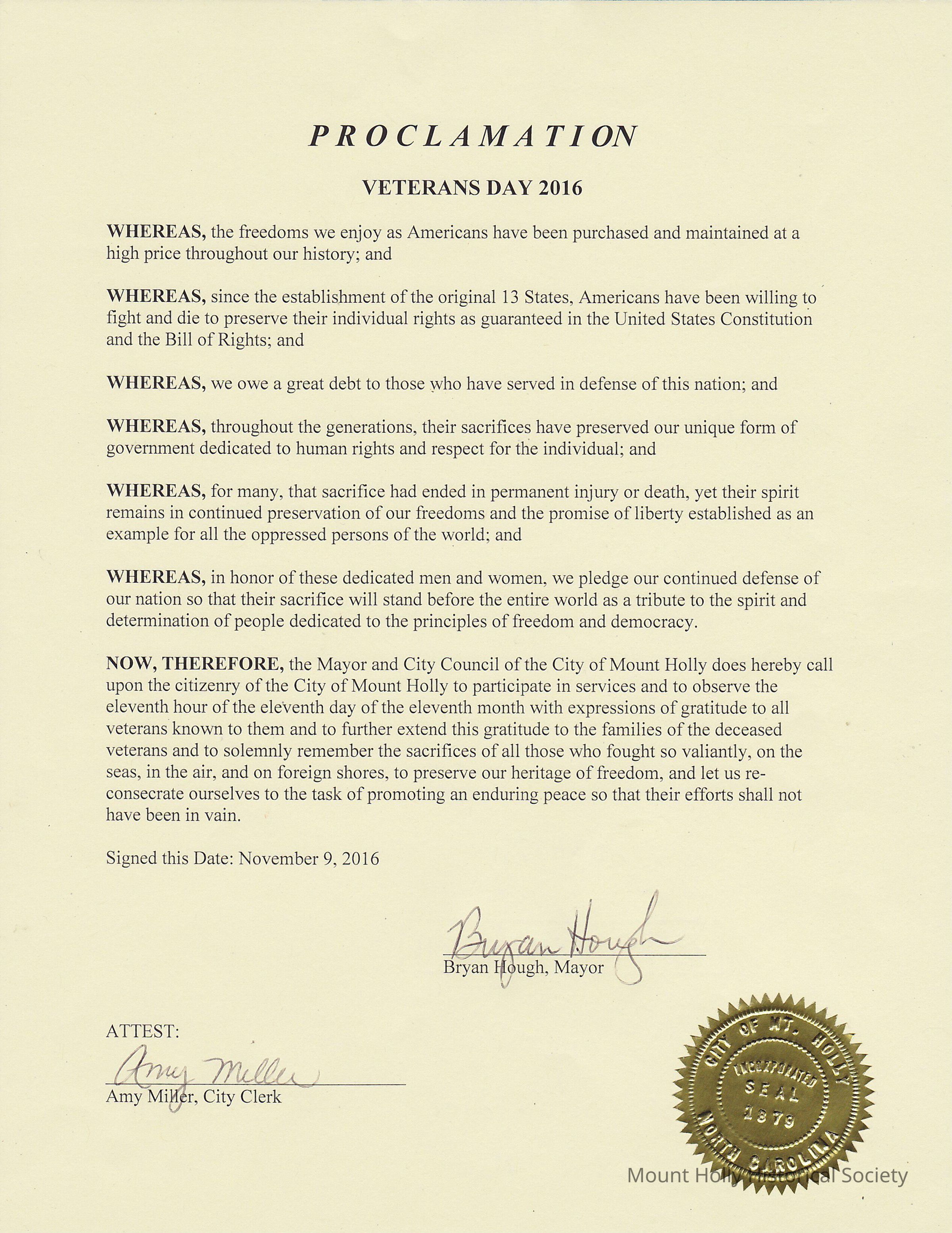 Veterans Day 2016 Proclamation signed by Brian Hough