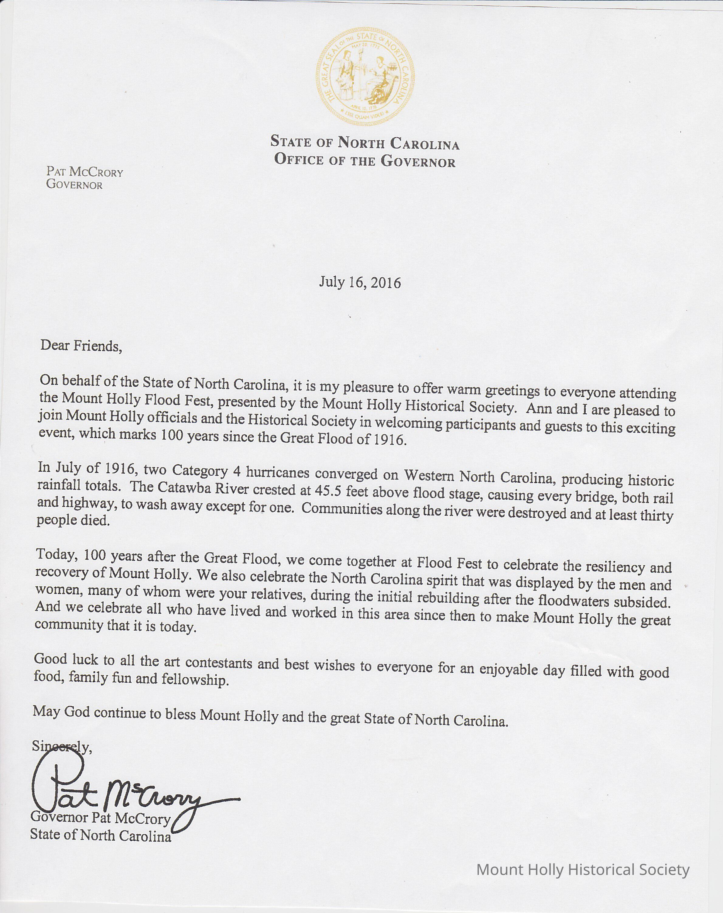 Letter from Pat McCrory endorsing the Mount Holly Flood Fest