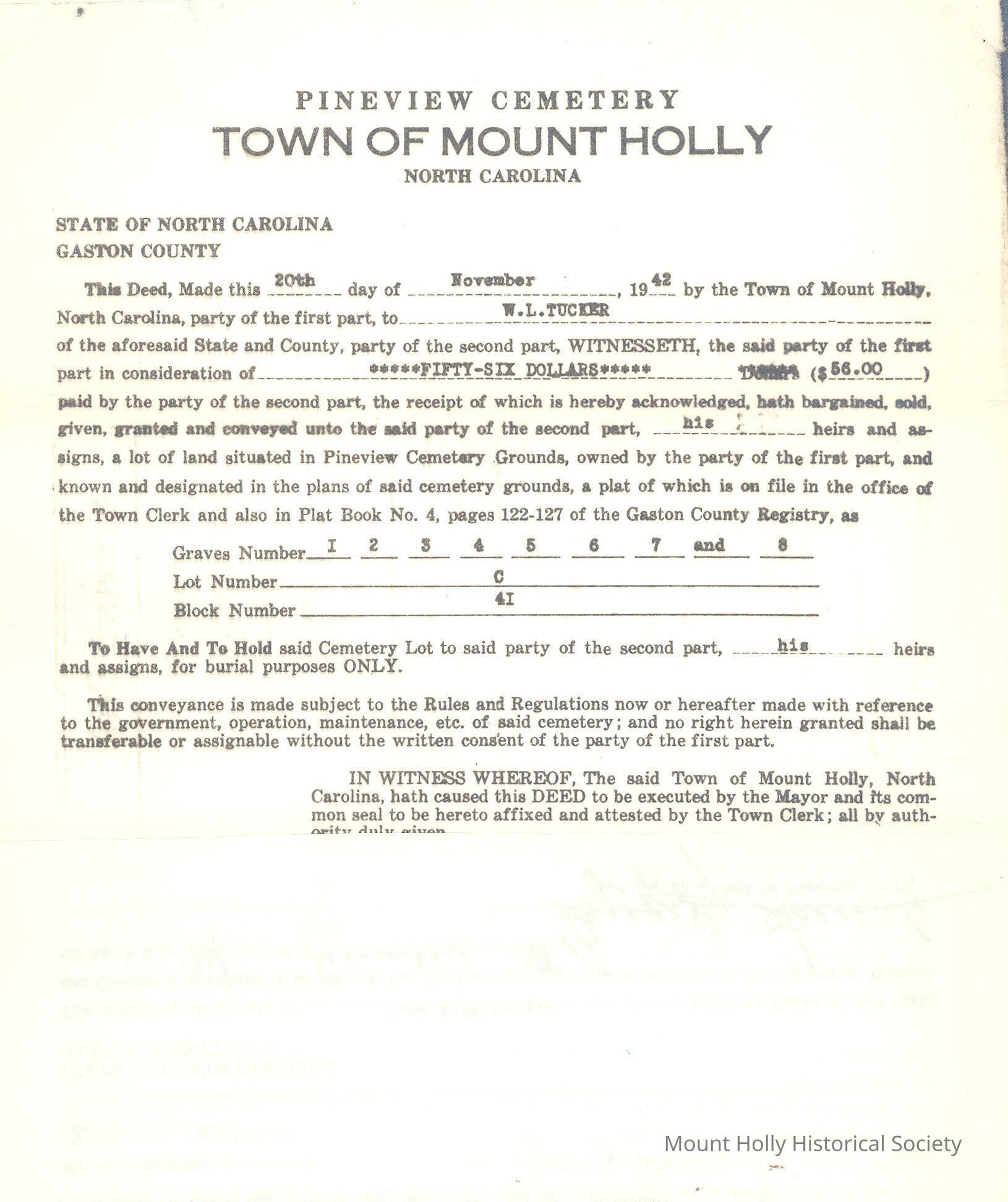 Cemetery deed for Pineview Cemetery, wherein Walter L. Tucker purchased eight plots for his family, along with document registering deed on Dec. 7, 1948