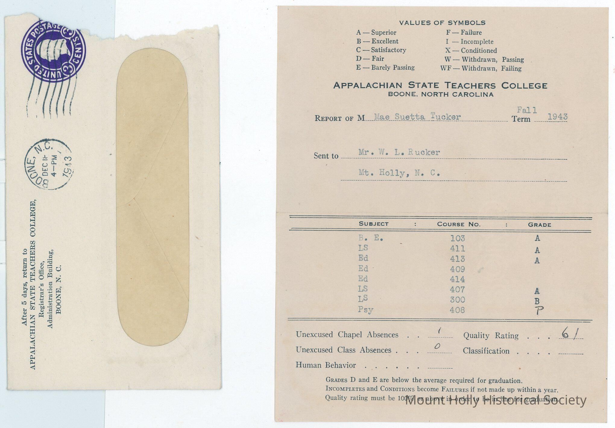 Report card from Appalachian State Teachers College to Mae Tucker for fall term of 1943, scanned with envelope