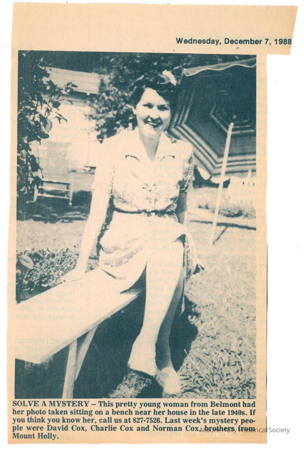 Photo from newspaper of an unidentified young woman sitting on a bench in Belmont in 1940s, asking readers to identify her