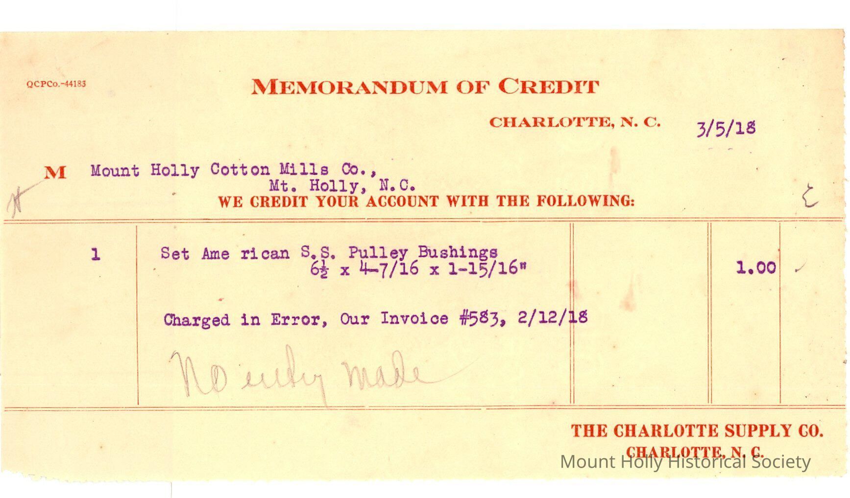 Memorandum of Credit from Charlotte Supply Co. to Mt. Holly Cotton Mills for pulley bushings