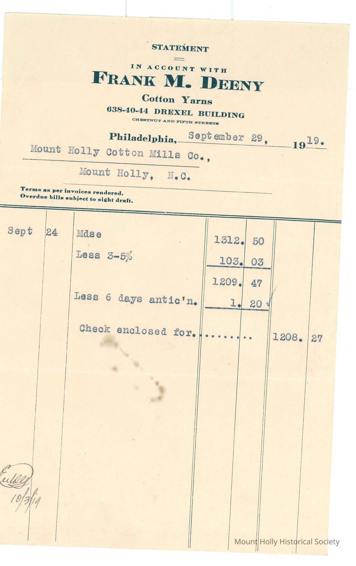 Statement from Frank M. Deeny to Mt. Holly Cotton Mills for merchandise