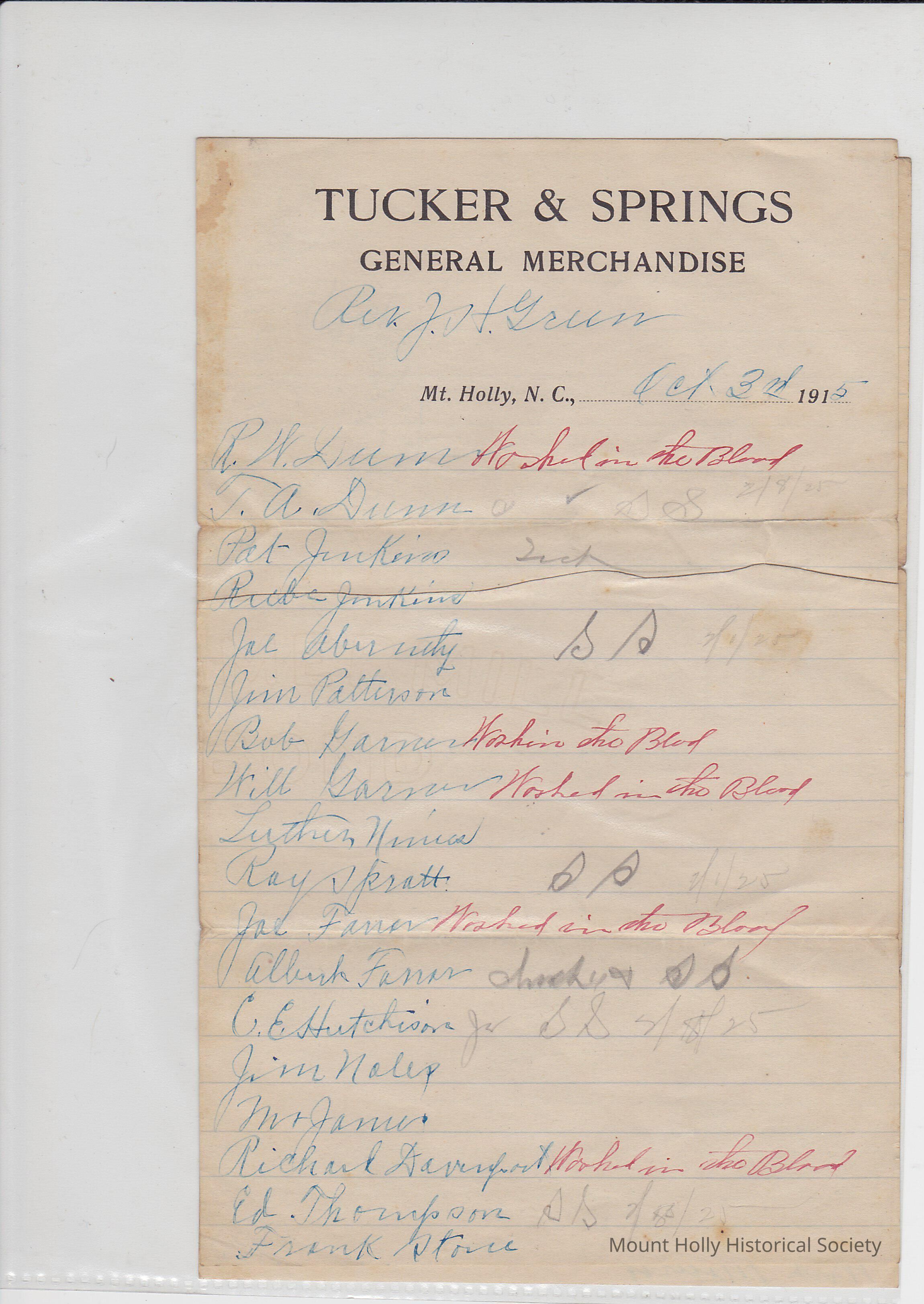 Tucker & Springs letterhead - Methodist Church member list? "Washed in Blood"