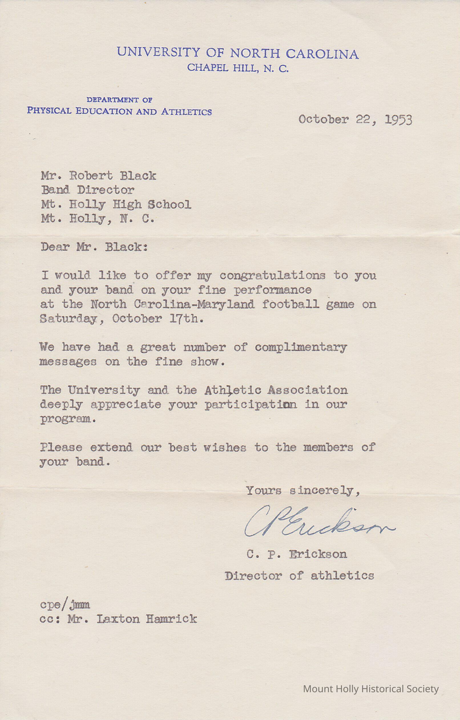 Letter from CP Erickson at UNC Chapel Hill to Robert Black, Band Directory Mount Holly High School regarding performance at UNCC vs Maryland Football Game