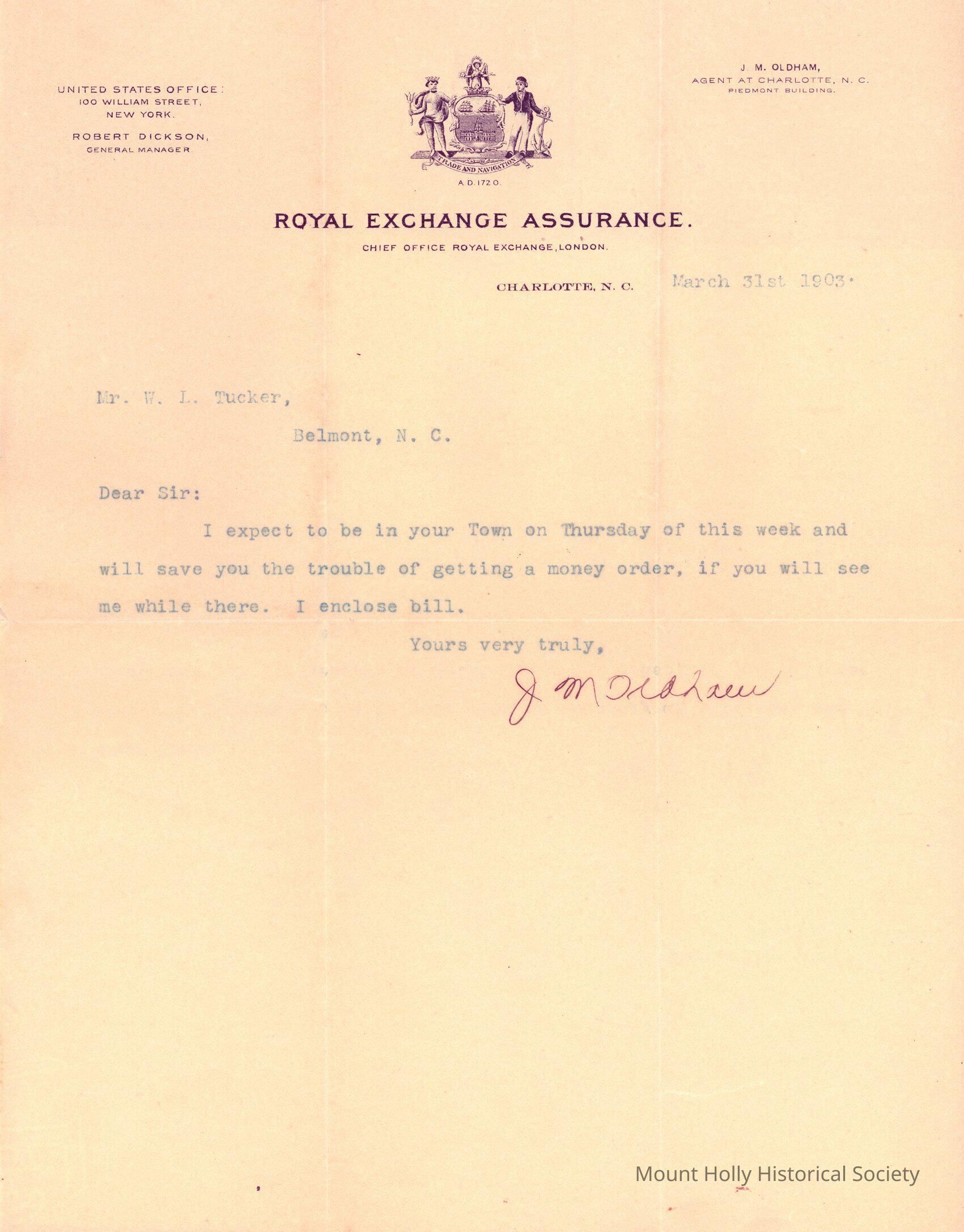 Letter from J.M. Oldham to W.L. Tucker, stating that Oldham would be in town and could get him a money order in person