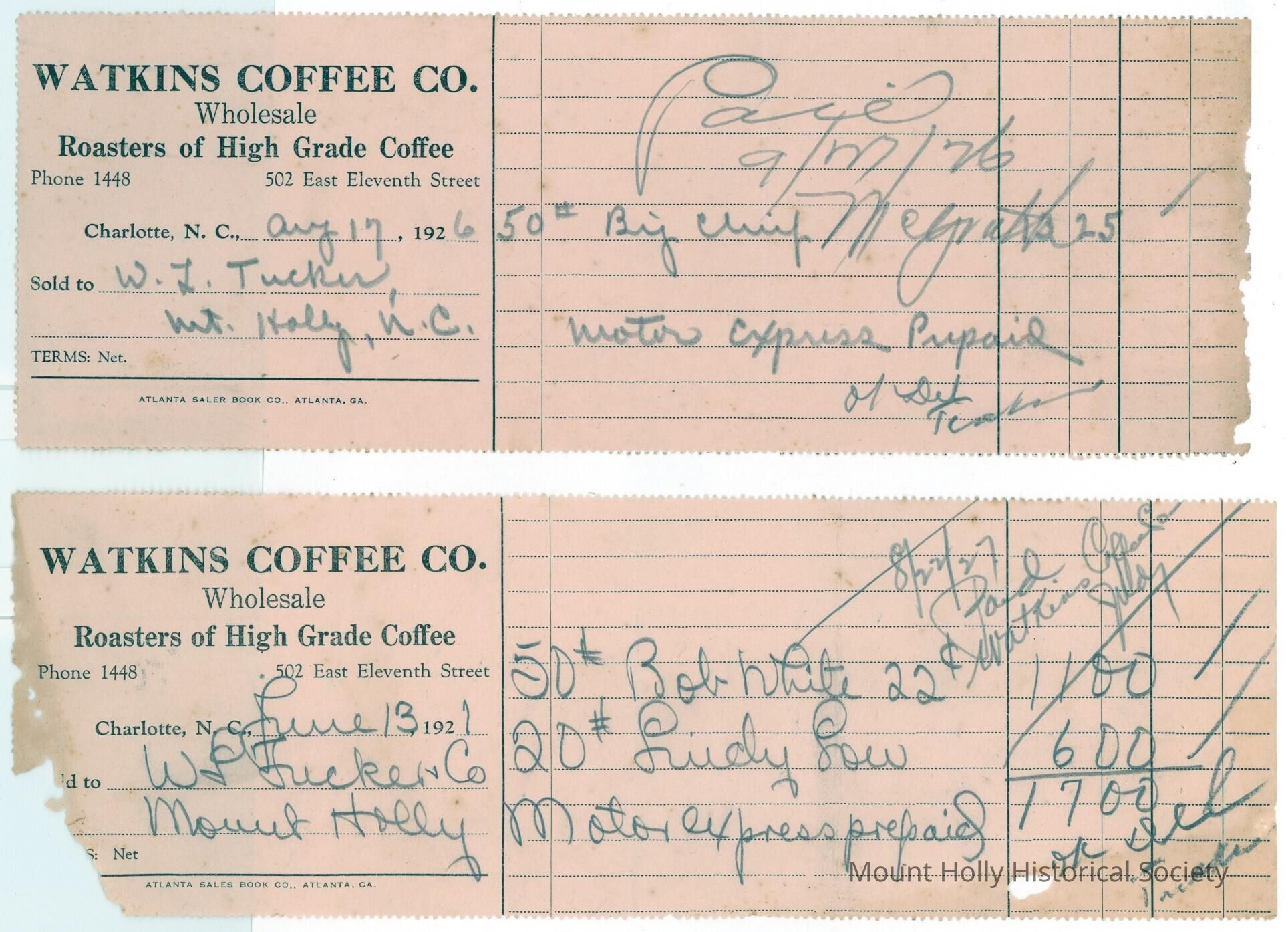 13 receipts (only two scanned) from Watkins Coffee Co. in Charlotte for coffee bought by W.L. Tucker