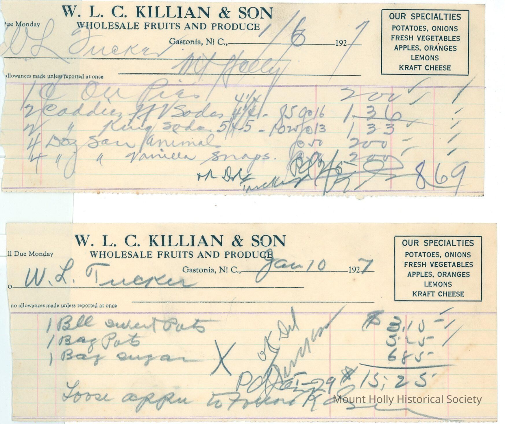 Numerous receipts (only two scanned) from W.L.C. Killian & Son to W.L. Tucker for fruits, vegetables, and other groceries