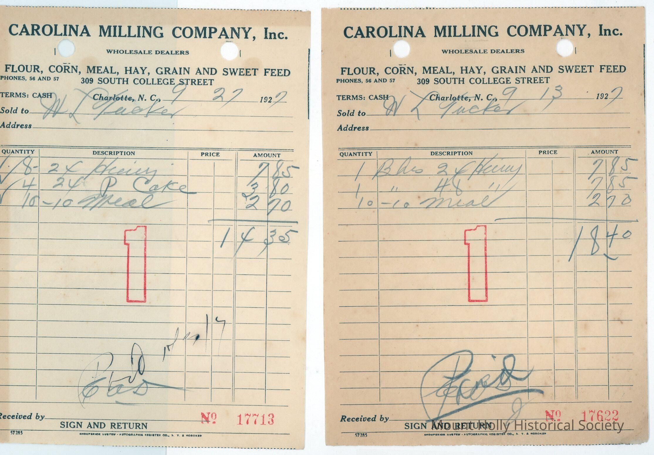 Numerous invoices (only two scanned) from Carolina Milling Co. in Charlotte to W.L. Tucker for meal and flour