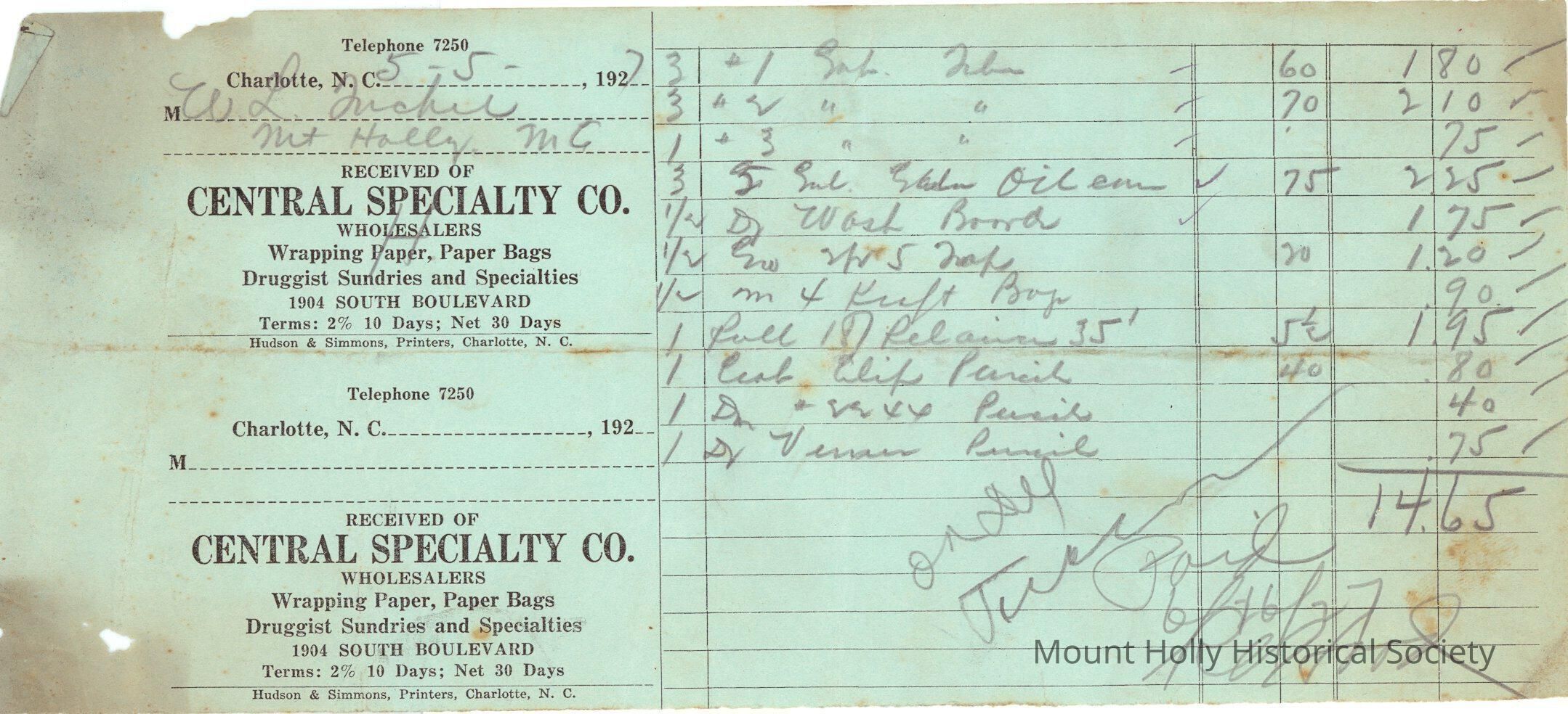 Numerous invoices (only one scanned) from Central Specialty Co. in Charlotte to W.L. Tucker for sundry goods
