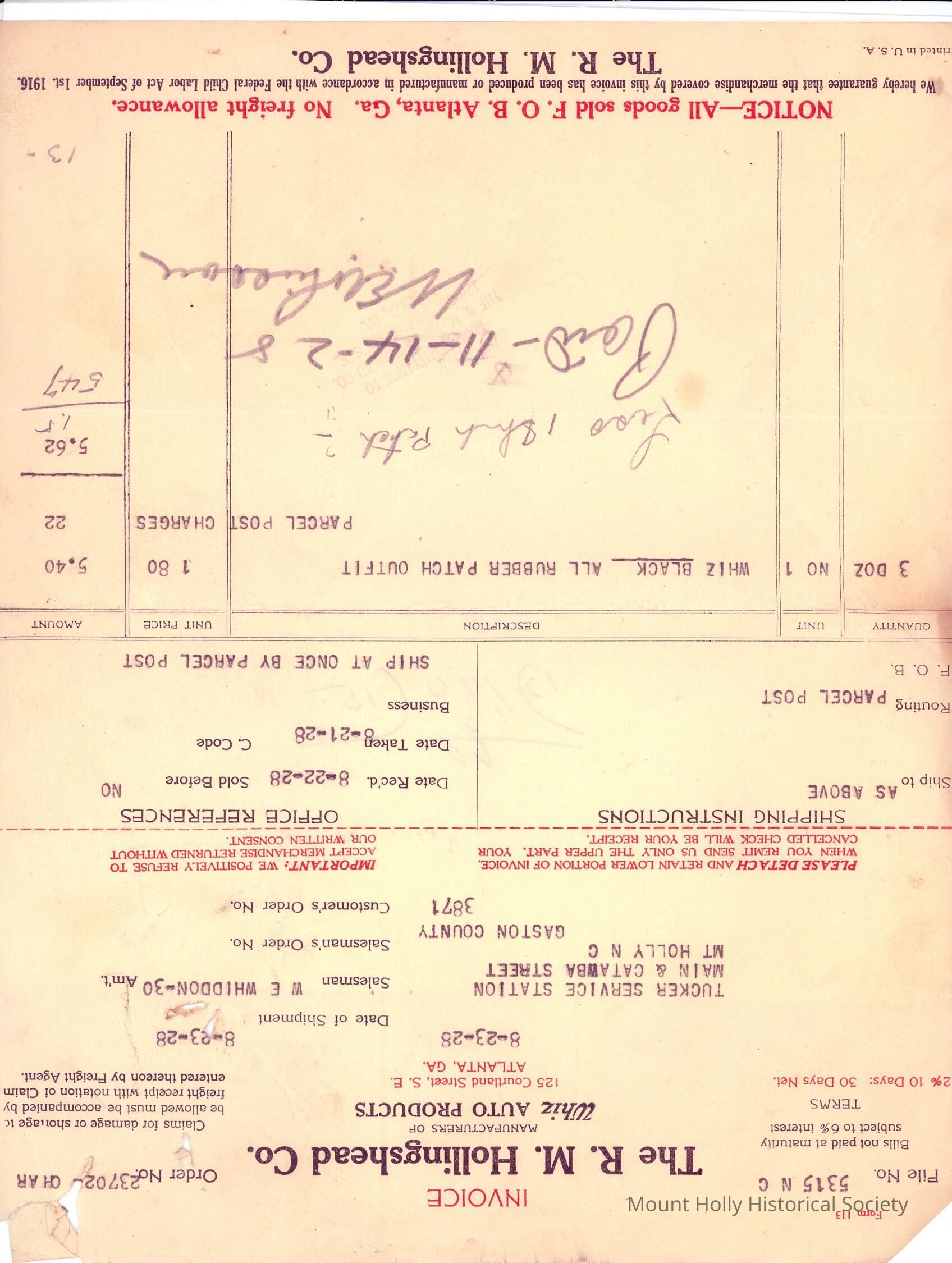 Invoice from the R.M. Hollinghead Co. in Atlanta to Tucker Service Station for black rubber patches