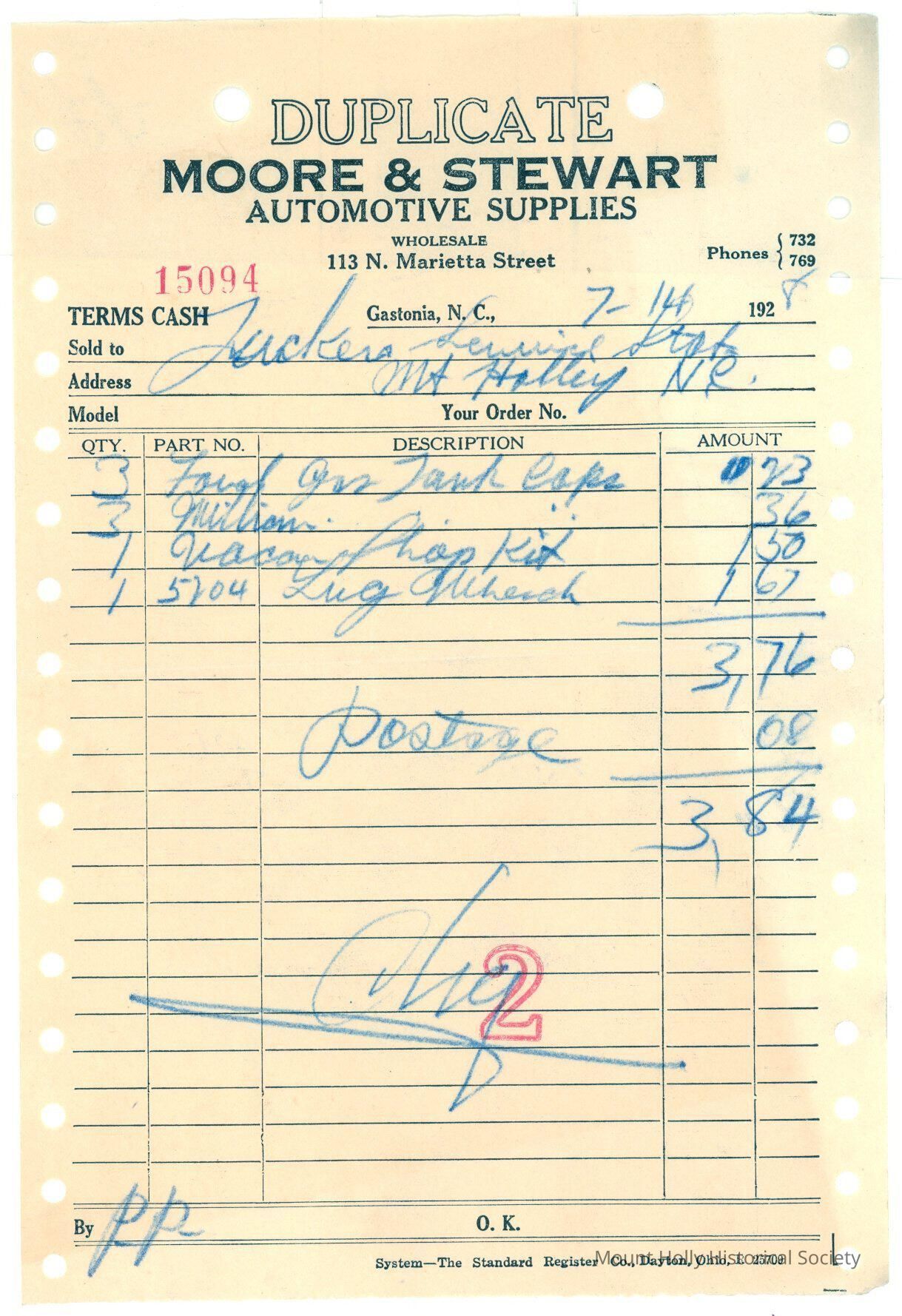 Three invoices (only one scanned) from Moore & Stewart Automobile Supplies in Gastonia to Tucker Service Station for various parts