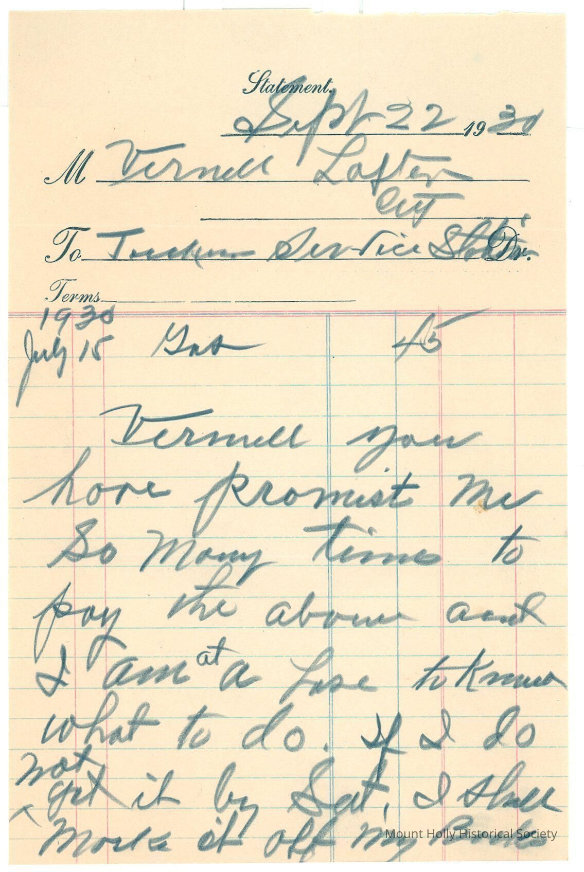 Letter from Vernell Lafter (?) to Tucker Service Station about an unpaid bill