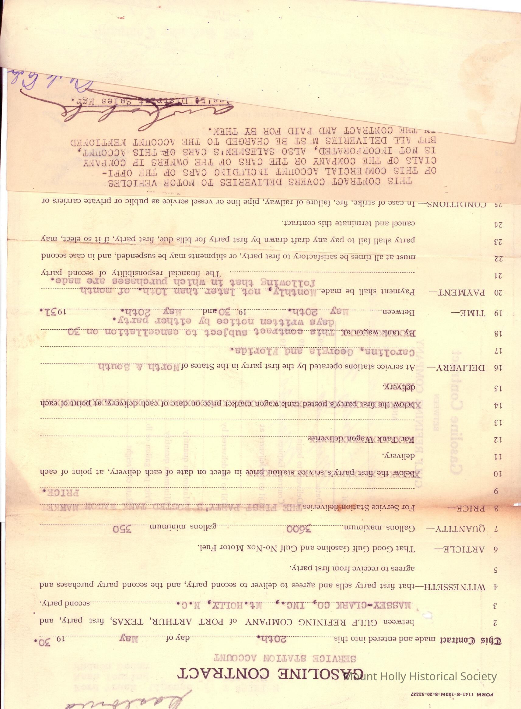 Gasoline contract between Gulf (in Port Arthur, TX) and Massey-Clark Co. of Mt. Holly, agreeing to provide fuel for the latter's company vehicles