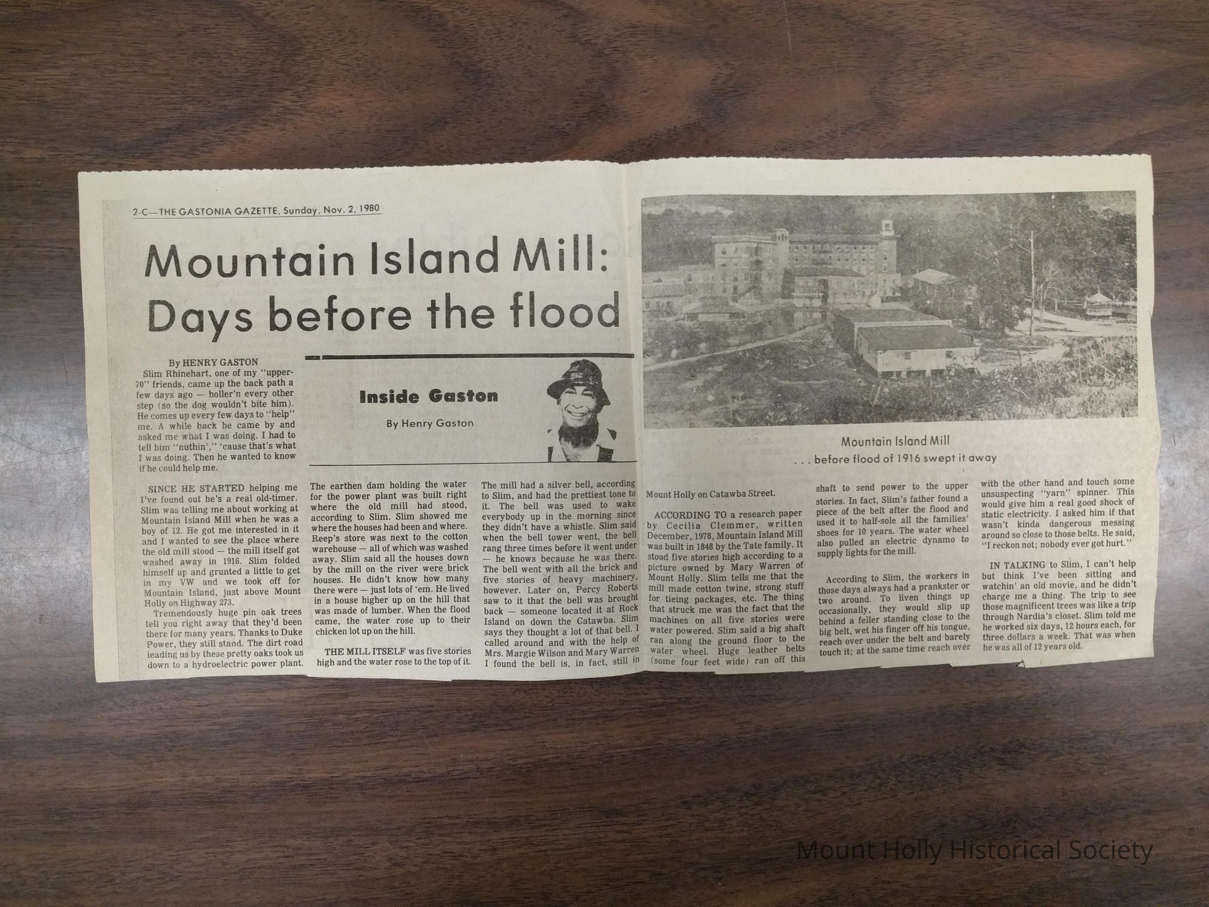 Article from Gastonia Gazette newspaper regarding Mountain Island Mill before the flood of 1916 By Henry Gaston