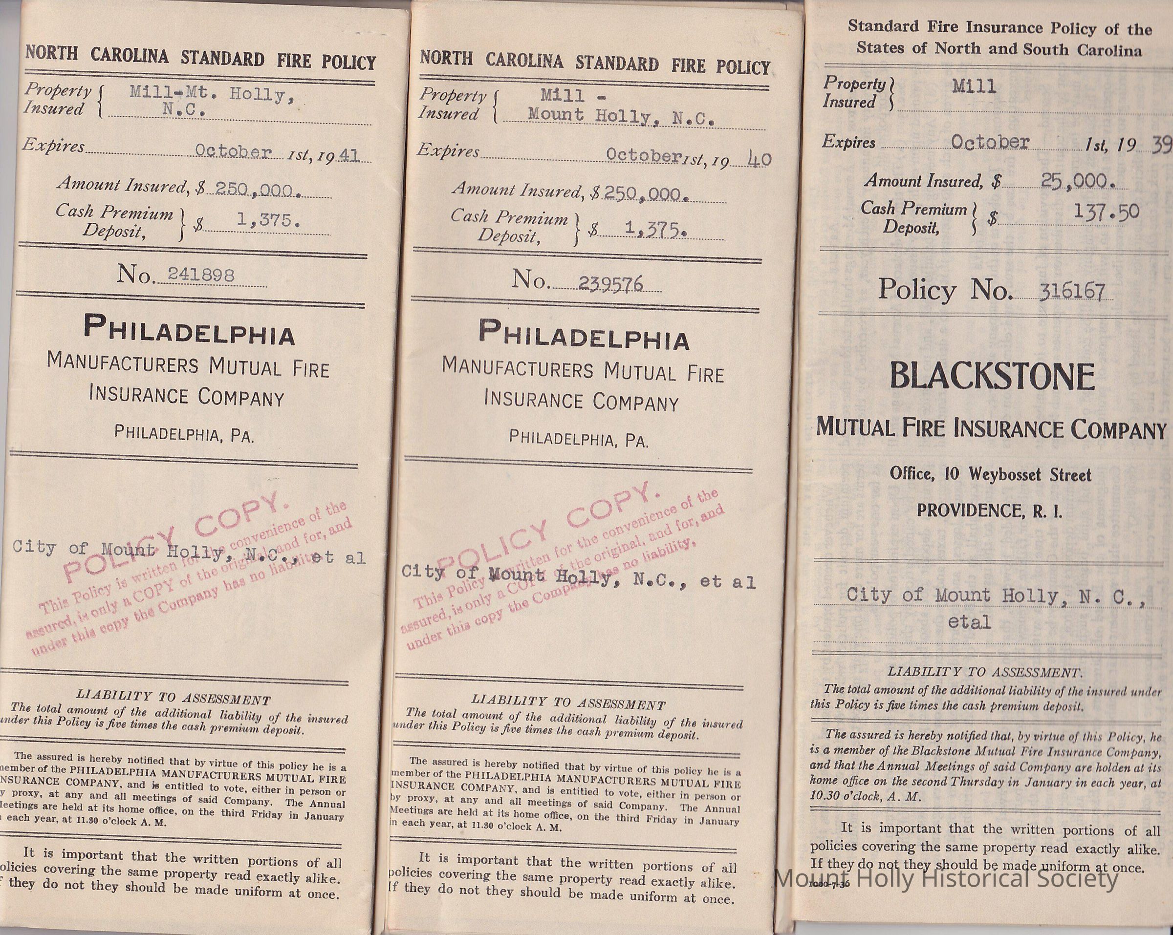 Certificates of Fire Insurance for Whitehall Knitting Mill - City of Mount Holly Second National Bank & American Yarn Processing