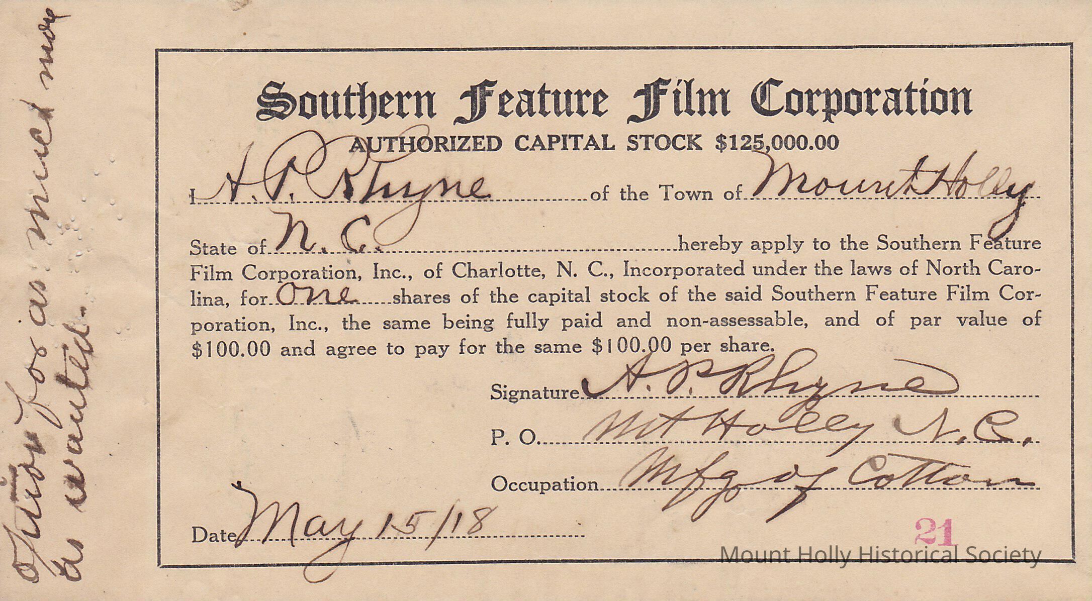 AP Rhyne purchase of stock in Southern Feature Film Corporation