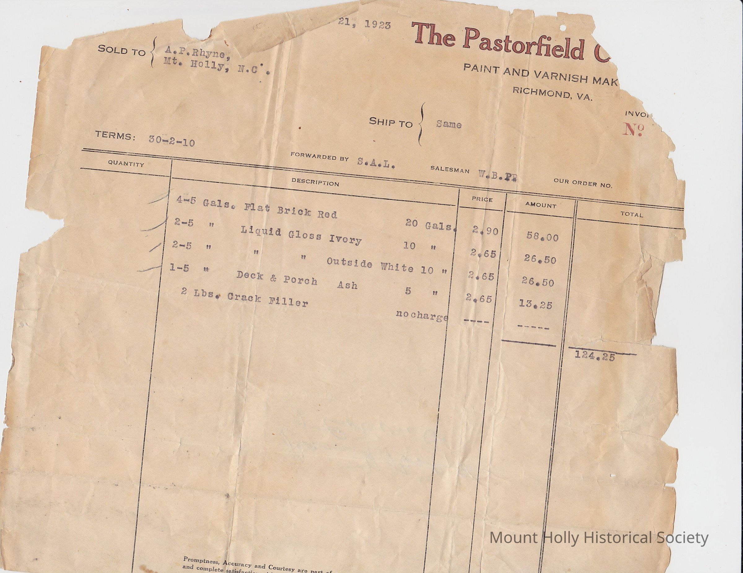 Invoice from the Pastorfield Co. to AP Rhyne for painting supplies