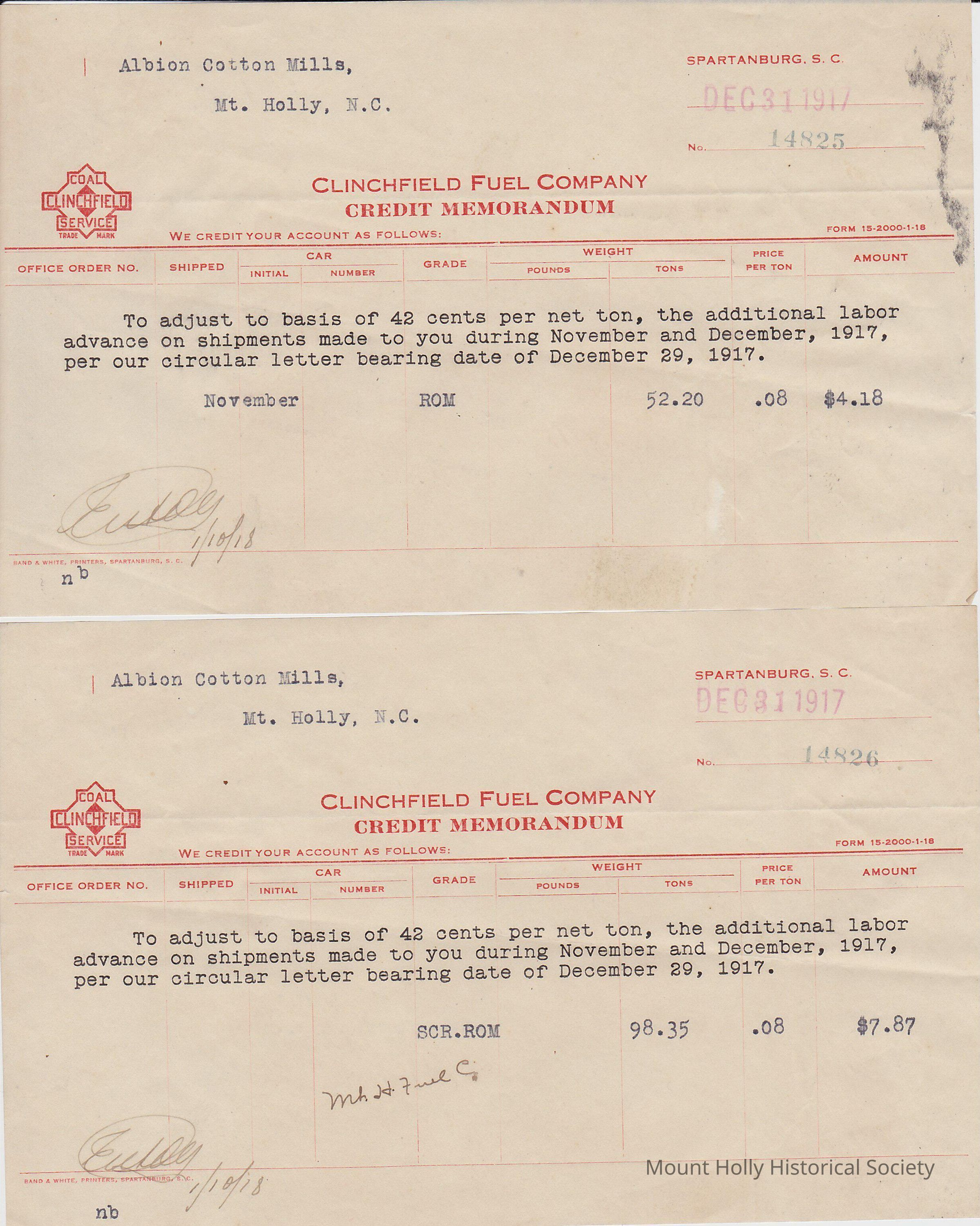 (8) Invoices from Clinchfield Fuel Company to Albion Cotton Mill - Mount Holly Fuel Company