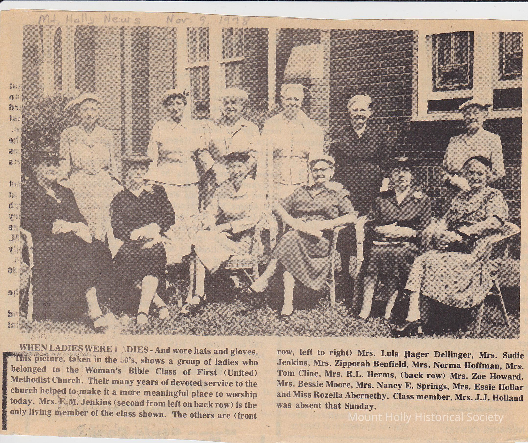 Women's Bible Class of First United Methodist Church - Front Row - Lula Hager Dellinger, Sudie Jenkins, Zipporah Benfield, Norma Hoffman, Mrs. Tom Cline, Mrs. RL Herms, Back Row: Zoe Howard, Mrs. EM Jenkins, BessieMoore, Nancy E Springs, Essie Hollar, Rozella Abernethy