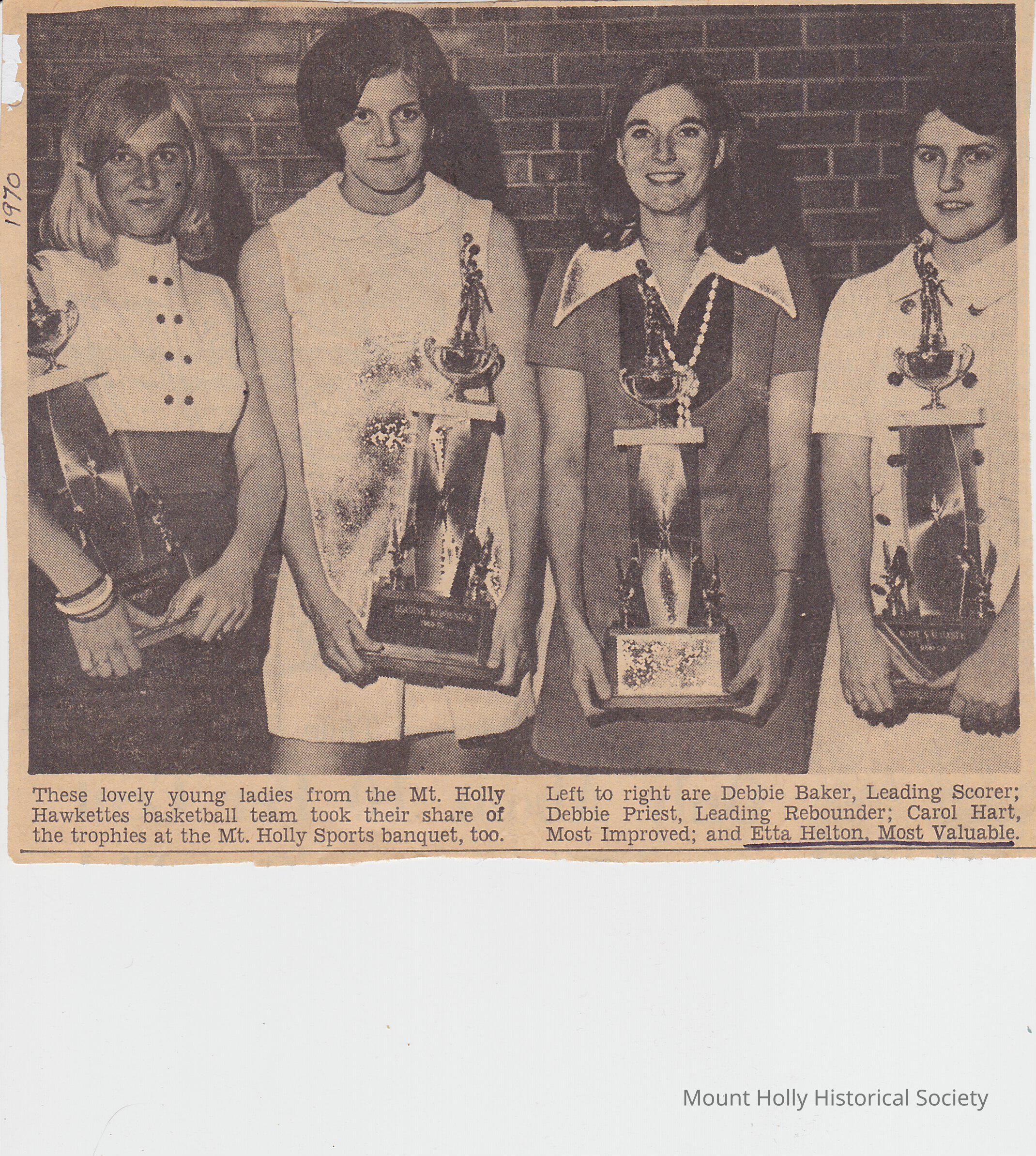 Mount Holly High School - Hawkette Basketball Team Trophies (L-R), Debbie Baker, Leading Scorer: Debbie Priest, Leading Rebounder: Carol hart, Most Improved and Most Valuable - Newspaper Clipping